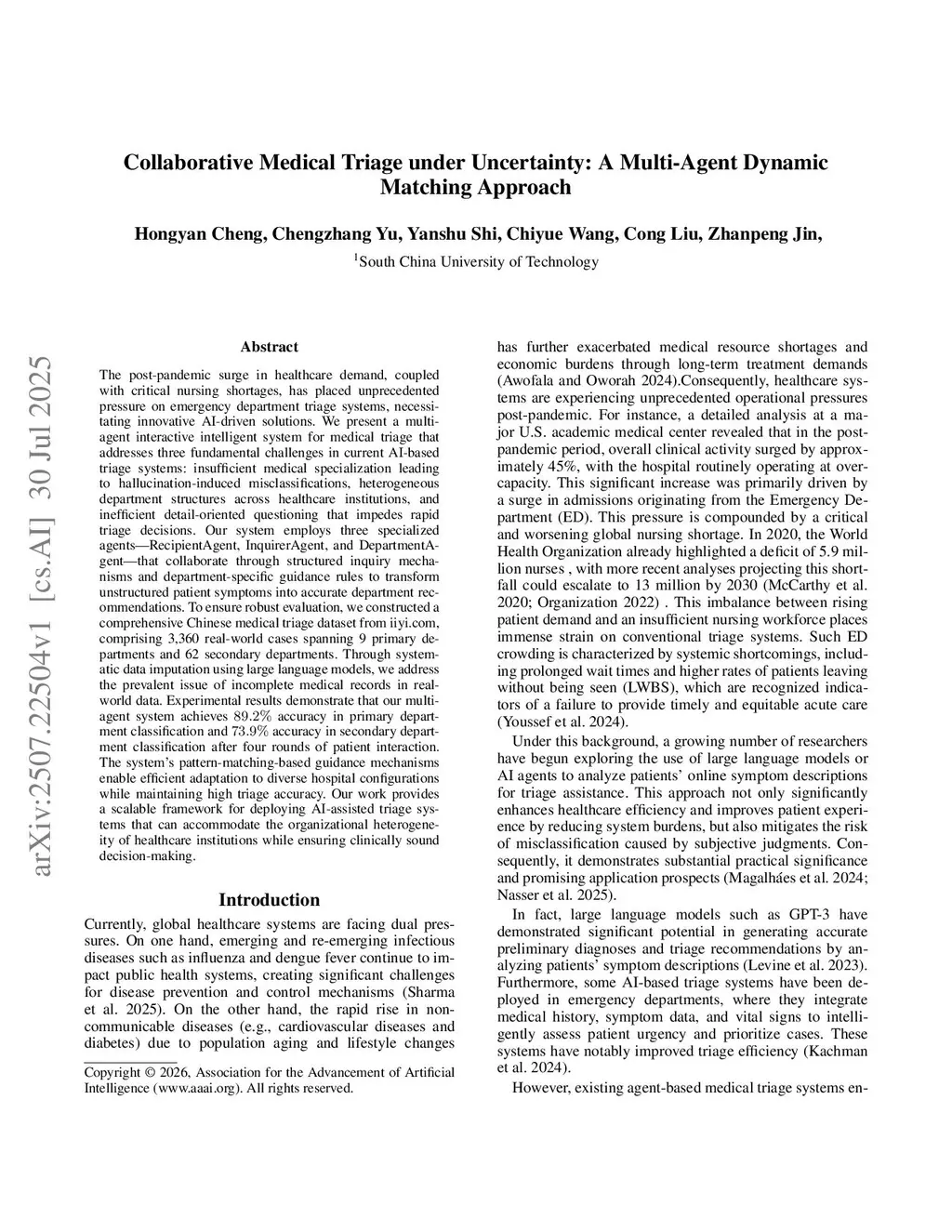 The post-pandemic surge in healthcare demand, coupled with critical nursing shortages, has placed unprecedented pressure on medical triage systems, necessitating innovative AI-driven solutions. We present a multi-agent interactive intelligent system for medical triage that addresses three fundamental challenges in current AI-based triage systems: inadequate medical specialization leading to misclassification, heterogeneous department structures across healthcare institutions, and inefficient detail-oriented questioning that impedes rapid triage decisions. Our system employs three specialized agents--RecipientAgent, InquirerAgent, and DepartmentAgent--that collaborate through Inquiry Guidance mechanism and Classification Guidance Mechanism to transform unstructured patient symptoms into accurate department recommendations. To ensure robust evaluation, we constructed a comprehensive Chinese medical triage dataset from "Ai Ai Yi Medical Network", comprising 3,360 real-world cases spanning 9 primary departments and 62 secondary departments. Experimental results demonstrate that our multi-agent system achieves 89.6% accuracy in primary department classification and 74.3% accuracy in secondary department classification after four rounds of patient interaction. The system's dynamic matching based guidance mechanisms enable efficient adaptation to diverse hospital configurations while maintaining high triage accuracy. We successfully developed this multi-agent triage system that not only adapts to organizational heterogeneity across healthcare institutions but also ensures clinically sound decision-making.
