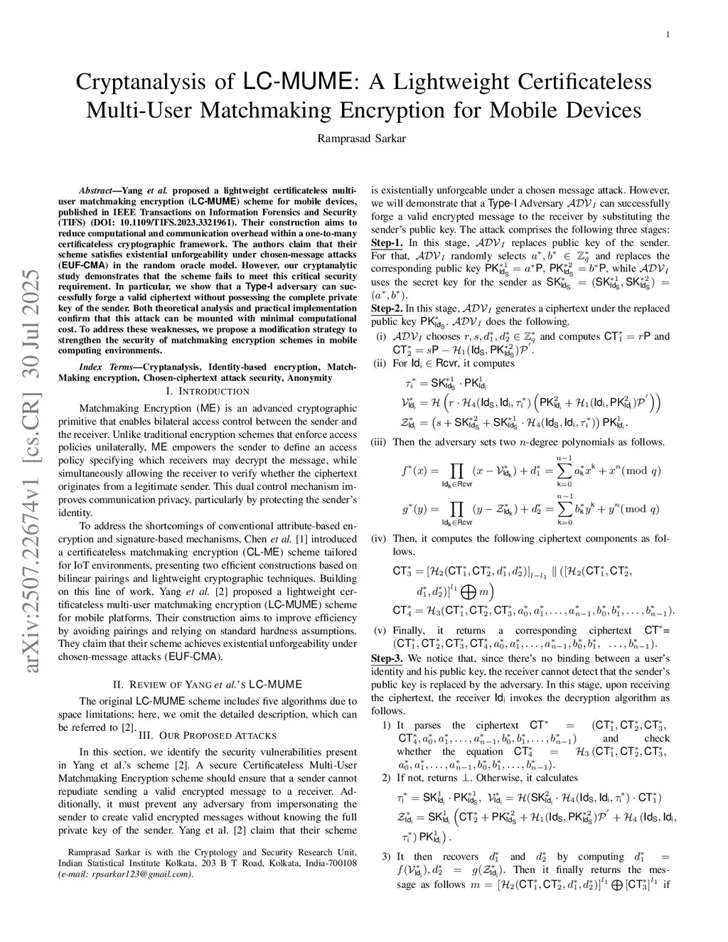 Cryptanalysis of LC-MUME: A Lightweight Certificateless Multi-User Matchmaking Encryption for Mobile Devices