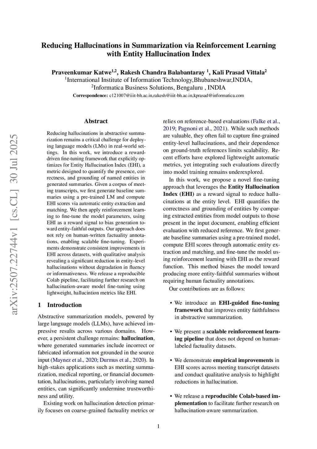 Reducing hallucinations in abstractive summarization remains a critical challenge for deploying language models (LMs) in real-world settings. In this work, we introduce a rewarddriven fine-tuning framework that explicitly optimizes for Entity Hallucination Index (EHI), a metric designed to quantify the presence, correctness, and grounding of named entities in generated summaries. Given a corpus of meeting transcripts, we first generate baseline summaries using a pre-trained LM and compute EHI scores via automatic entity extraction and matching. We then apply reinforcement learning to fine-tune the model parameters, using EHI as a reward signal to bias generation toward entity-faithful outputs. Our approach does not rely on human-written factuality annotations, enabling scalable fine-tuning. Experiments demonstrate consistent improvements in EHI across datasets, with qualitative analysis revealing a significant reduction in entity-level hallucinations without degradation in fluency or informativeness. We release a reproducible Colab pipeline, facilitating further research on hallucination-aware model fine-tuning using lightweight, hallucintion metrics like EHI.