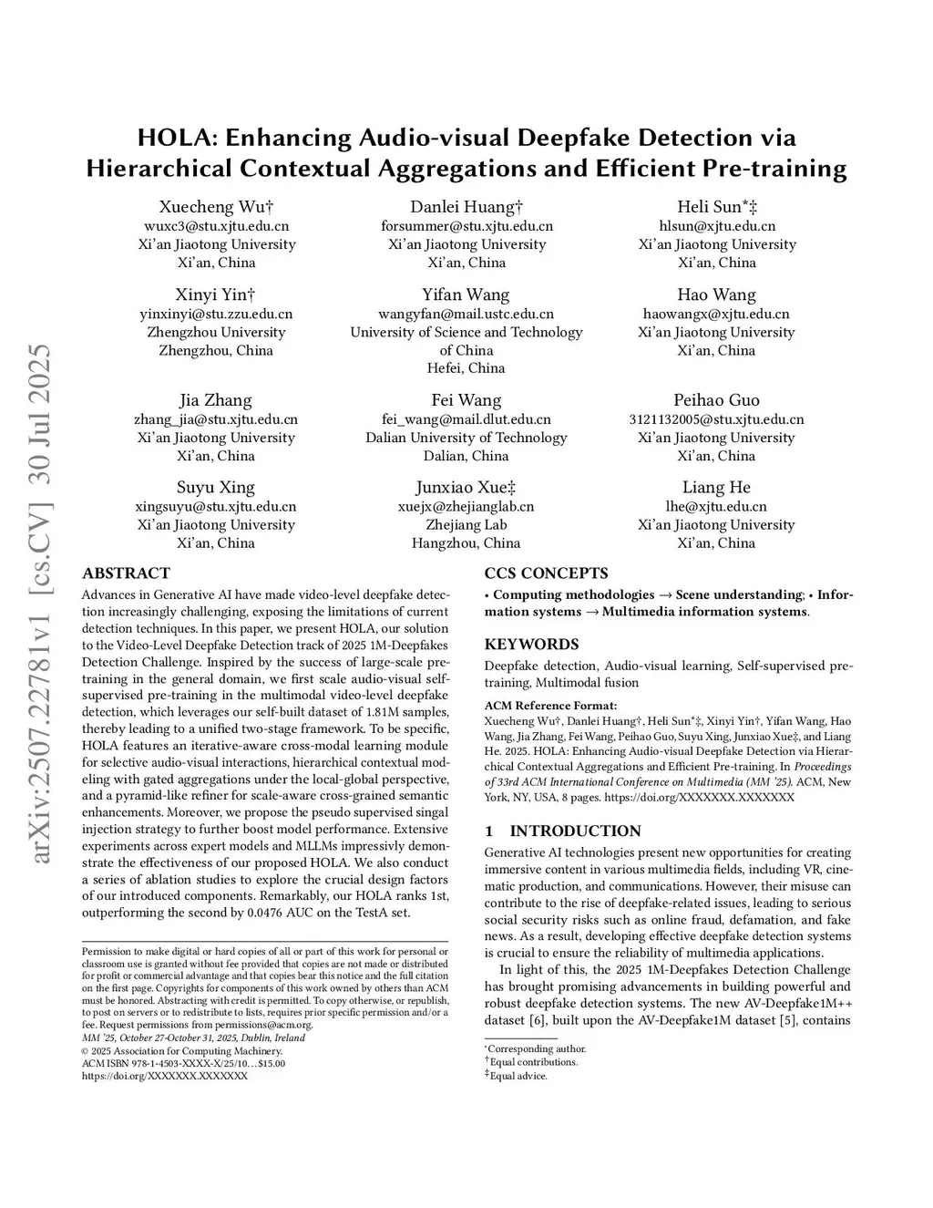 Advances in Generative AI have made video-level deepfake detection increasingly challenging, exposing the limitations of current detection techniques. In this paper, we present HOLA, our solution to the Video-Level Deepfake Detection track of 2025 1M-Deepfakes Detection Challenge. Inspired by the success of large-scale pre-training in the general domain, we first scale audio-visual self-supervised pre-training in the multimodal video-level deepfake detection, which leverages our self-built dataset of 1.81M samples, thereby leading to a unified two-stage framework. To be specific, HOLA features an iterative-aware cross-modal learning module for selective audio-visual interactions, hierarchical contextual modeling with gated aggregations under the local-global perspective, and a pyramid-like refiner for scale-aware cross-grained semantic enhancements. Moreover, we propose the pseudo supervised singal injection strategy to further boost model performance. Extensive experiments across expert models and MLLMs impressivly demonstrate the effectiveness of our proposed HOLA. We also conduct a series of ablation studies to explore the crucial design factors of our introduced components. Remarkably, our HOLA ranks 1st, outperforming the second by 0.0476 AUC on the TestA set.