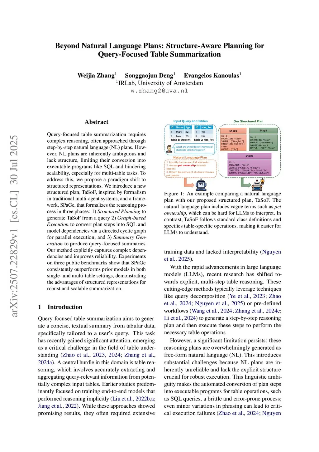 Query-focused table summarization requires complex reasoning, often approached through step-by-step natural language (NL) plans. However, NL plans are inherently ambiguous and lack structure, limiting their conversion into executable programs like SQL and hindering scalability, especially for multi-table tasks. To address this, we propose a paradigm shift to structured representations. We introduce a new structured plan, TaSoF, inspired by formalism in traditional multi-agent systems, and a framework, SPaGe, that formalizes the reasoning process in three phases: 1) Structured Planning to generate TaSoF from a query, 2) Graph-based Execution to convert plan steps into SQL and model dependencies via a directed cyclic graph for parallel execution, and 3) Summary Generation to produce query-focused summaries. Our method explicitly captures complex dependencies and improves reliability. Experiments on three public benchmarks show that SPaGe consistently outperforms prior models in both single- and multi-table settings, demonstrating the advantages of structured representations for robust and scalable summarization.