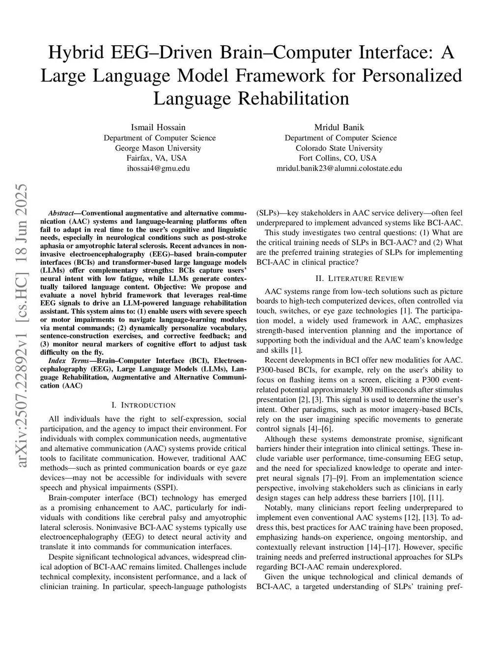 Hybrid EEG--Driven Brain--Computer Interface: A Large Language Model Framework for Personalized Language Rehabilitation