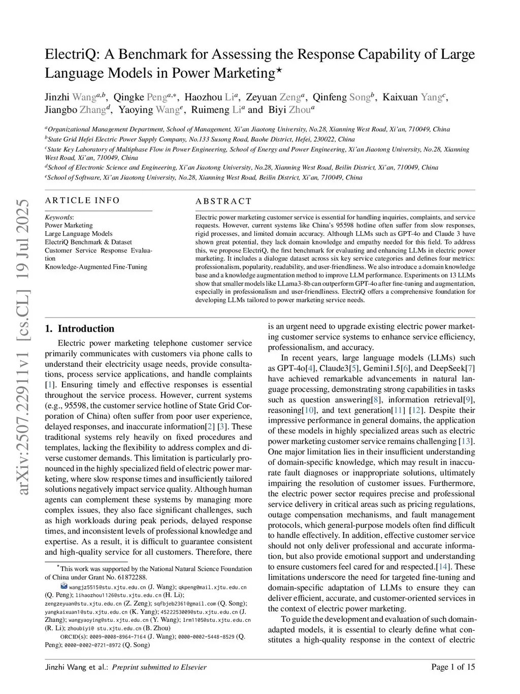 Electric power marketing customer service plays a critical role in addressing inquiries, complaints, and service requests. However, current systems, such as China's 95598 hotline, often struggle with slow response times, inflexible procedures, and limited accuracy in domain-specific tasks. While large language models (LLMs) like GPT-4o and Claude 3 demonstrate strong general capabilities, they lack the domain expertise and empathy required in this field. To bridge this gap, we introduce ElectriQ, the first benchmark designed to evaluate and enhance LLMs in electric power marketing scenarios. ElectriQ consists of a dialogue dataset covering six key service categories and introduces four evaluation metrics: professionalism, popularity, readability, and user-friendliness. We further incorporate a domain-specific knowledge base and propose a knowledge augmentation method to boost model performance. Experiments on 13 LLMs reveal that smaller models such as LLama3-8B, when fine-tuned and augmented, can surpass GPT-4o in terms of professionalism and user-friendliness. ElectriQ establishes a comprehensive foundation for developing LLMs tailored to the needs of power marketing services.