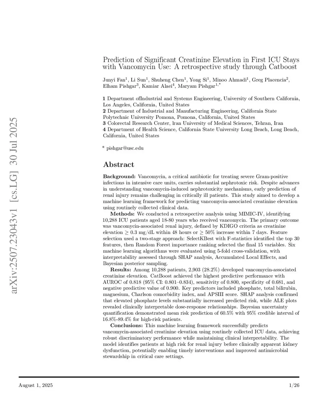 Prediction of Significant Creatinine Elevation in First ICU Stays with Vancomycin Use: A retrospective study through Catboost