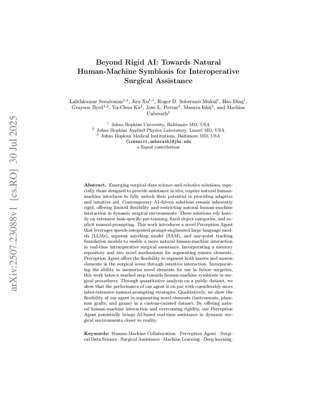 Emerging surgical data science and robotics solutions, especially those designed to provide assistance in situ, require natural human-machine interfaces to fully unlock their potential in providing adaptive and intuitive aid. Contemporary AI-driven solutions remain inherently rigid, offering limited flexibility and restricting natural human-machine interaction in dynamic surgical environments. These solutions rely heavily on extensive task-specific pre-training, fixed object categories, and explicit manual-prompting. This work introduces a novel Perception Agent that leverages speech-integrated prompt-engineered large language models (LLMs), segment anything model (SAM), and any-point tracking foundation models to enable a more natural human-machine interaction in real-time intraoperative surgical assistance. Incorporating a memory repository and two novel mechanisms for segmenting unseen elements, Perception Agent offers the flexibility to segment both known and unseen elements in the surgical scene through intuitive interaction. Incorporating the ability to memorize novel elements for use in future surgeries, this work takes a marked step towards human-machine symbiosis in surgical procedures. Through quantitative analysis on a public dataset, we show that the performance of our agent is on par with considerably more labor-intensive manual-prompting strategies. Qualitatively, we show the flexibility of our agent in segmenting novel elements (instruments, phantom grafts, and gauze) in a custom-curated dataset. By offering natural human-machine interaction and overcoming rigidity, our Perception Agent potentially brings AI-based real-time assistance in dynamic surgical environments closer to reality.