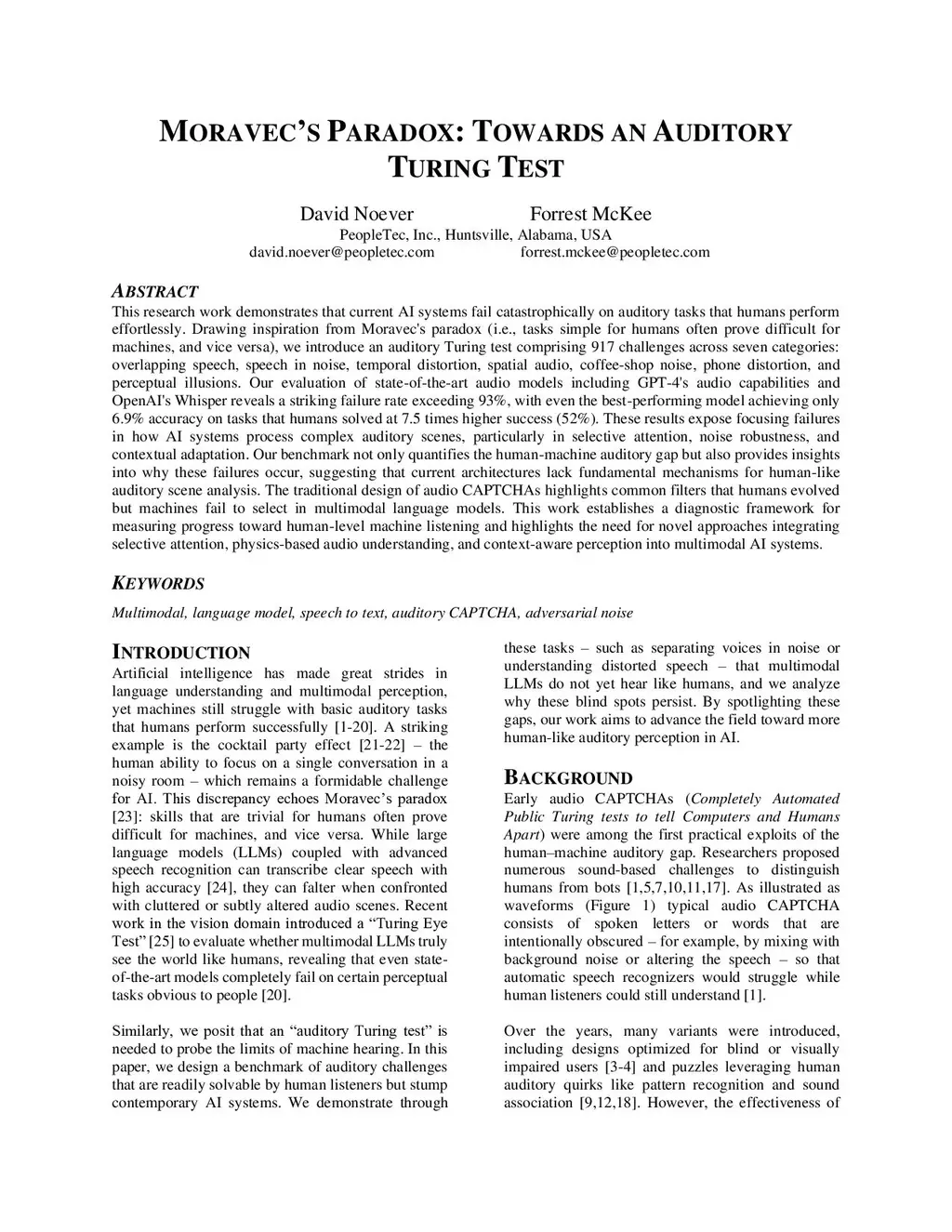 This research work demonstrates that current AI systems fail catastrophically on auditory tasks that humans perform effortlessly. Drawing inspiration from Moravec's paradox (i.e., tasks simple for humans often prove difficult for machines, and vice versa), we introduce an auditory Turing test comprising 917 challenges across seven categories: overlapping speech, speech in noise, temporal distortion, spatial audio, coffee-shop noise, phone distortion, and perceptual illusions. Our evaluation of state-of-the-art audio models including GPT-4's audio capabilities and OpenAI's Whisper reveals a striking failure rate exceeding 93%, with even the best-performing model achieving only 6.9% accuracy on tasks that humans solved at 7.5 times higher success (52%). These results expose focusing failures in how AI systems process complex auditory scenes, particularly in selective attention, noise robustness, and contextual adaptation. Our benchmark not only quantifies the human-machine auditory gap but also provides insights into why these failures occur, suggesting that current architectures lack fundamental mechanisms for human-like auditory scene analysis. The traditional design of audio CAPTCHAs highlights common filters that humans evolved but machines fail to select in multimodal language models. This work establishes a diagnostic framework for measuring progress toward human-level machine listening and highlights the need for novel approaches integrating selective attention, physics-based audio understanding, and context-aware perception into multimodal AI systems.