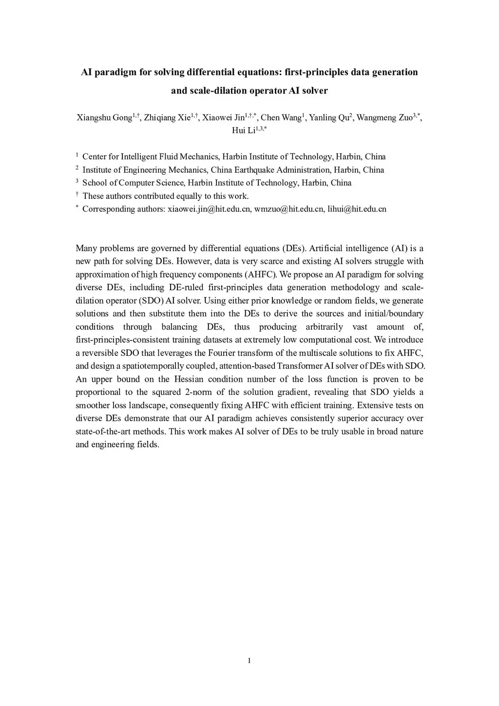 Many problems are governed by differential equations (DEs). Artificial intelligence (AI) is a new path for solving DEs. However, data is very scarce and existing AI solvers struggle with approximation of high frequency components (AHFC). We propose an AI paradigm for solving diverse DEs, including DE-ruled first-principles data generation methodology and scale-dilation operator (SDO) AI solver. Using either prior knowledge or random fields, we generate solutions and then substitute them into the DEs to derive the sources and initial/boundary conditions through balancing DEs, thus producing arbitrarily vast amount of, first-principles-consistent training datasets at extremely low computational cost. We introduce a reversible SDO that leverages the Fourier transform of the multiscale solutions to fix AHFC, and design a spatiotemporally coupled, attention-based Transformer AI solver of DEs with SDO. An upper bound on the Hessian condition number of the loss function is proven to be proportional to the squared 2-norm of the solution gradient, revealing that SDO yields a smoother loss landscape, consequently fixing AHFC with efficient training. Extensive tests on diverse DEs demonstrate that our AI paradigm achieves consistently superior accuracy over state-of-the-art methods. This work makes AI solver of DEs to be truly usable in broad nature and engineering fields.
