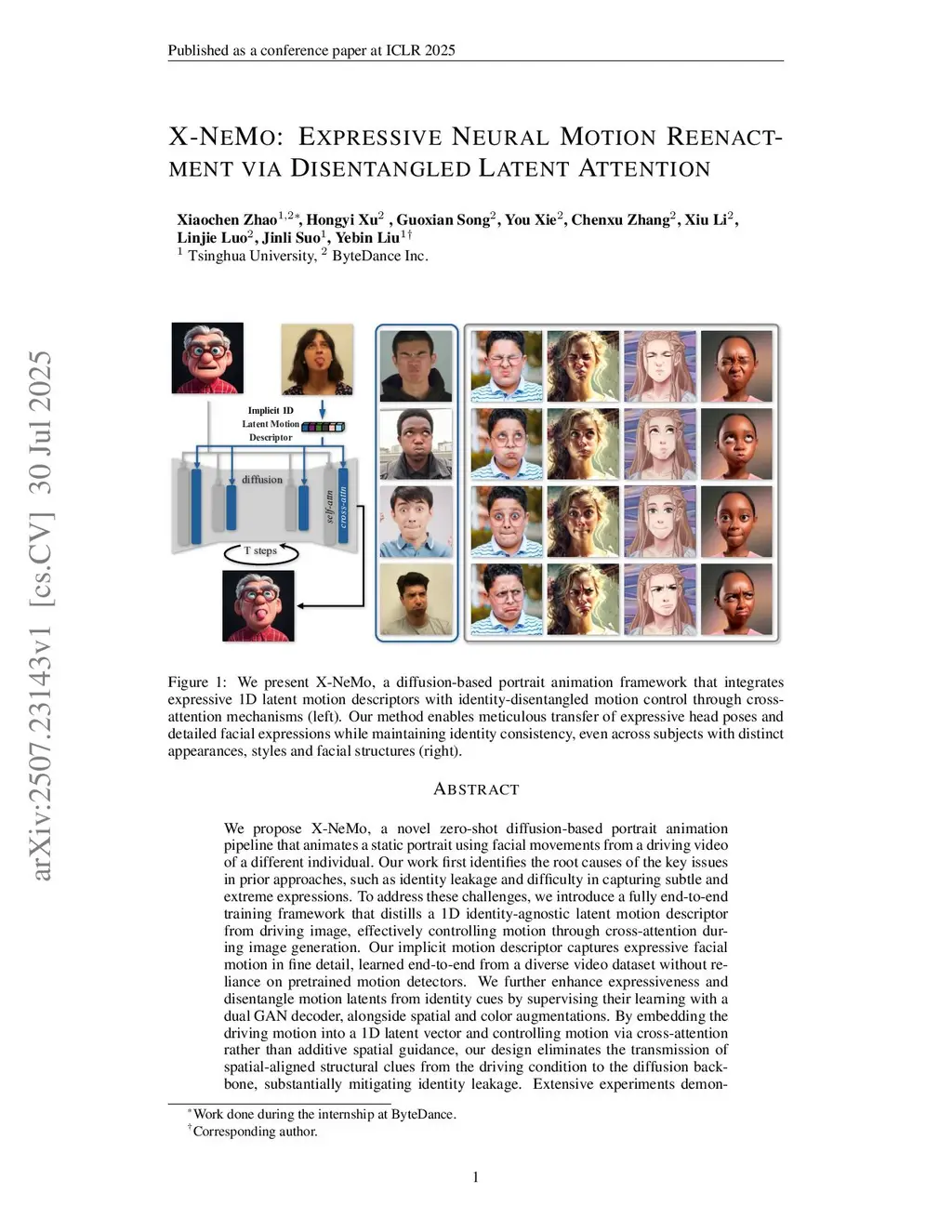 We propose X-NeMo, a novel zero-shot diffusion-based portrait animation pipeline that animates a static portrait using facial movements from a driving video of a different individual. Our work first identifies the root causes of the key issues in prior approaches, such as identity leakage and difficulty in capturing subtle and extreme expressions. To address these challenges, we introduce a fully end-to-end training framework that distills a 1D identity-agnostic latent motion descriptor from driving image, effectively controlling motion through cross-attention during image generation. Our implicit motion descriptor captures expressive facial motion in fine detail, learned end-to-end from a diverse video dataset without reliance on pretrained motion detectors. We further enhance expressiveness and disentangle motion latents from identity cues by supervising their learning with a dual GAN decoder, alongside spatial and color augmentations. By embedding the driving motion into a 1D latent vector and controlling motion via cross-attention rather than additive spatial guidance, our design eliminates the transmission of spatial-aligned structural clues from the driving condition to the diffusion backbone, substantially mitigating identity leakage. Extensive experiments demonstrate that X-NeMo surpasses state-of-the-art baselines, producing highly expressive animations with superior identity resemblance. Our code and models are available for research.