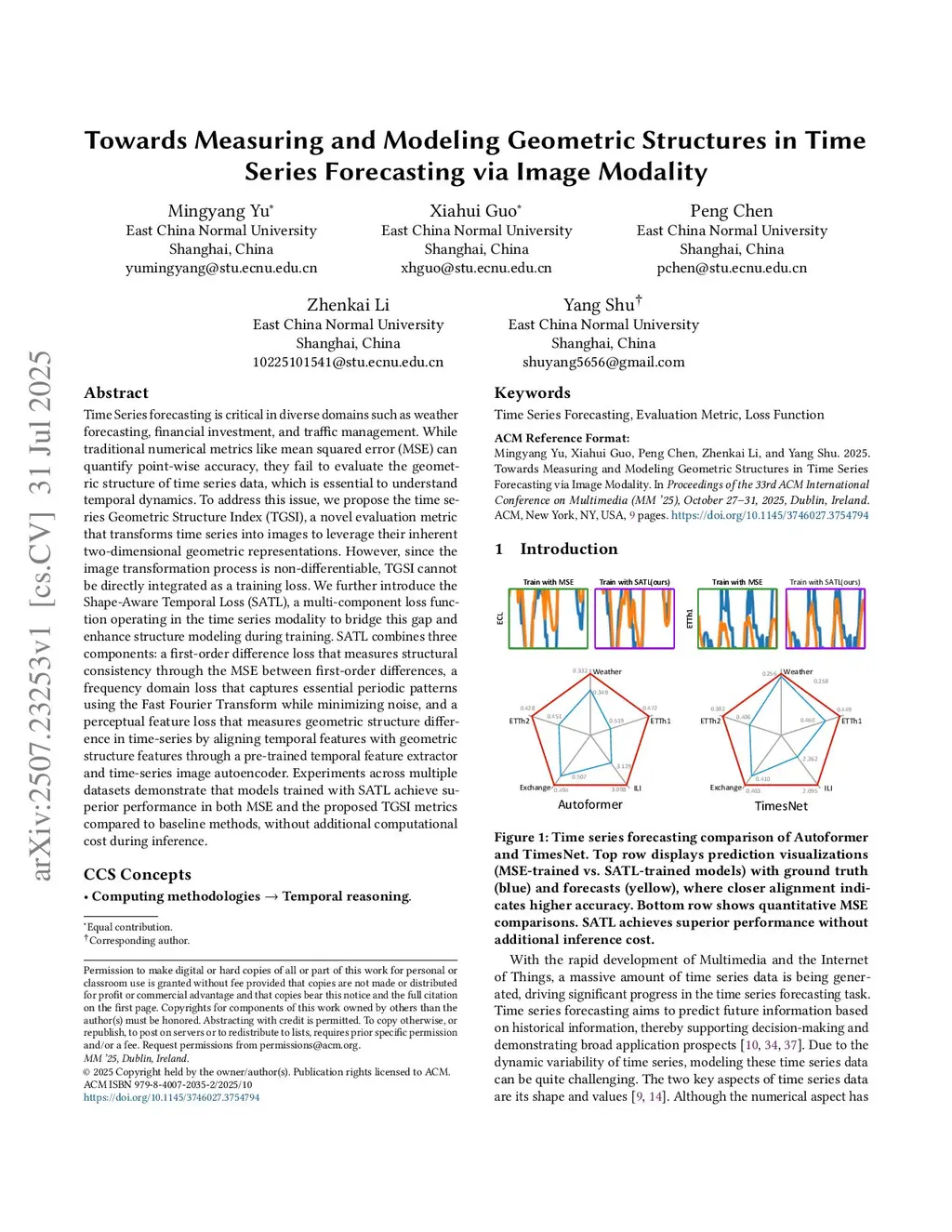 Time Series forecasting is critical in diverse domains such as weather forecasting, financial investment, and traffic management. While traditional numerical metrics like mean squared error (MSE) can quantify point-wise accuracy, they fail to evaluate the geometric structure of time series data, which is essential to understand temporal dynamics. To address this issue, we propose the time series Geometric Structure Index (TGSI), a novel evaluation metric that transforms time series into images to leverage their inherent two-dimensional geometric representations. However, since the image transformation process is non-differentiable, TGSI cannot be directly integrated as a training loss. We further introduce the Shape-Aware Temporal Loss (SATL), a multi-component loss function operating in the time series modality to bridge this gap and enhance structure modeling during training. SATL combines three components: a first-order difference loss that measures structural consistency through the MSE between first-order differences, a frequency domain loss that captures essential periodic patterns using the Fast Fourier Transform while minimizing noise, and a perceptual feature loss that measures geometric structure difference in time-series by aligning temporal features with geometric structure features through a pre-trained temporal feature extractor and time-series image autoencoder. Experiments across multiple datasets demonstrate that models trained with SATL achieve superior performance in both MSE and the proposed TGSI metrics compared to baseline methods, without additional computational cost during inference.