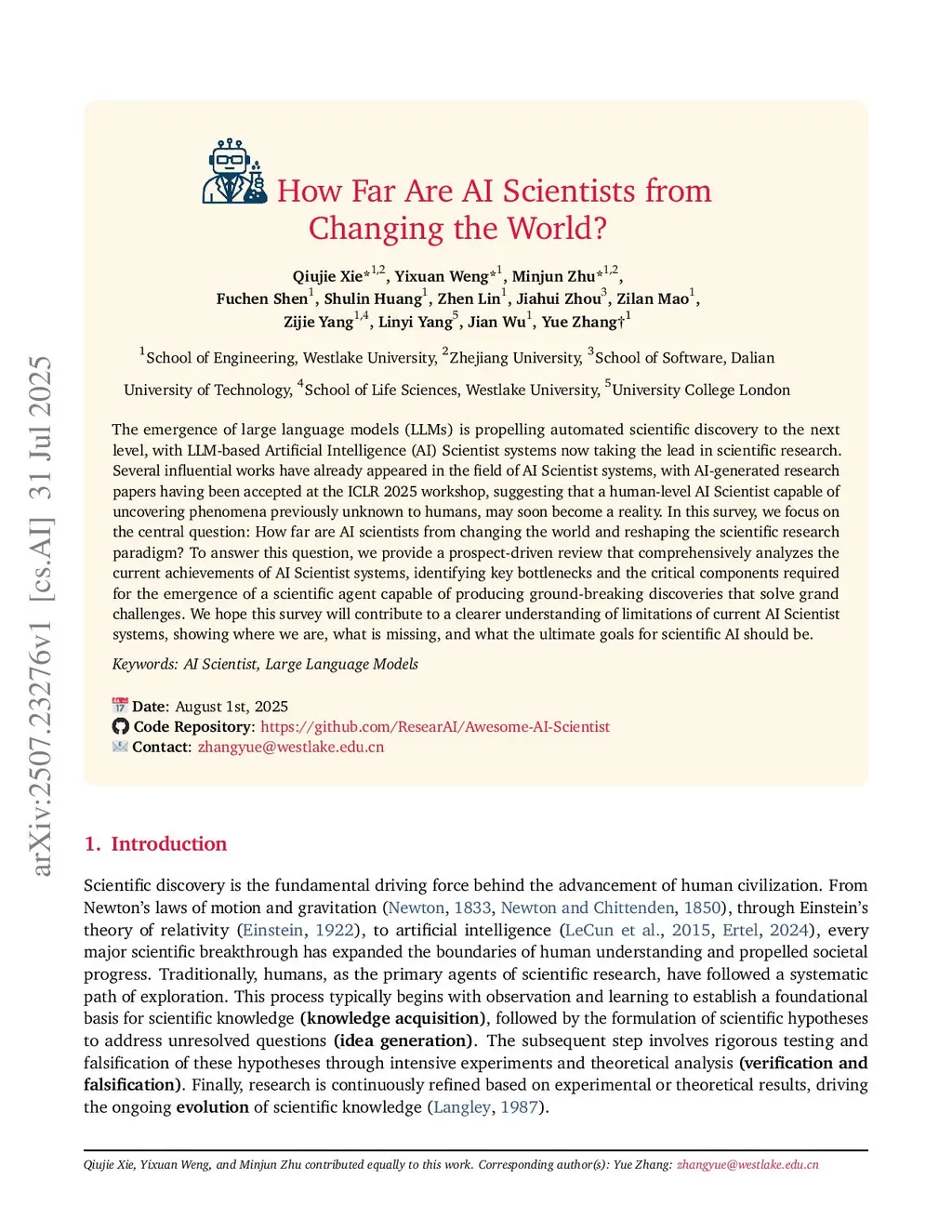 The emergence of large language models (LLMs) is propelling automated scientific discovery to the next level, with LLM-based Artificial Intelligence (AI) Scientist systems now taking the lead in scientific research. Several influential works have already appeared in the field of AI Scientist systems, with AI-generated research papers having been accepted at the ICLR 2025 workshop, suggesting that a human-level AI Scientist capable of uncovering phenomena previously unknown to humans, may soon become a reality. In this survey, we focus on the central question: How far are AI scientists from changing the world and reshaping the scientific research paradigm? To answer this question, we provide a prospect-driven review that comprehensively analyzes the current achievements of AI Scientist systems, identifying key bottlenecks and the critical components required for the emergence of a scientific agent capable of producing ground-breaking discoveries that solve grand challenges. We hope this survey will contribute to a clearer understanding of limitations of current AI Scientist systems, showing where we are, what is missing, and what the ultimate goals for scientific AI should be.