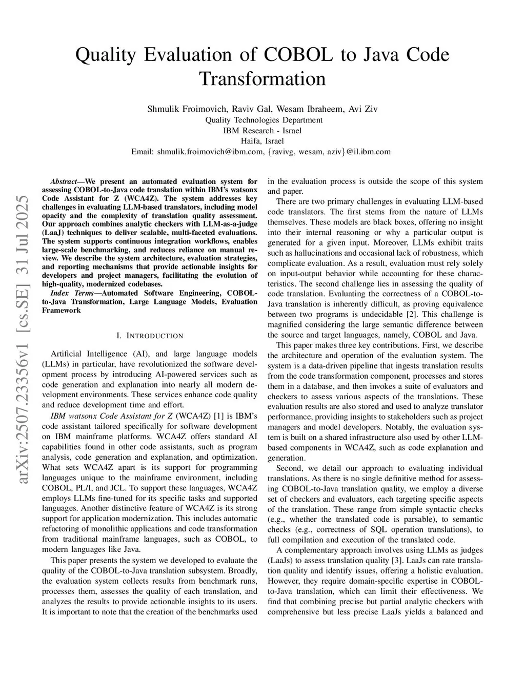 We present an automated evaluation system for assessing COBOL-to-Java code translation within IBM's watsonx Code Assistant for Z (WCA4Z). The system addresses key challenges in evaluating LLM-based translators, including model opacity and the complexity of translation quality assessment. Our approach combines analytic checkers with LLM-as-a-judge (LaaJ) techniques to deliver scalable, multi-faceted evaluations. The system supports continuous integration workflows, enables large-scale benchmarking, and reduces reliance on manual review. We describe the system architecture, evaluation strategies, and reporting mechanisms that provide actionable insights for developers and project managers, facilitating the evolution of high-quality, modernized codebases.