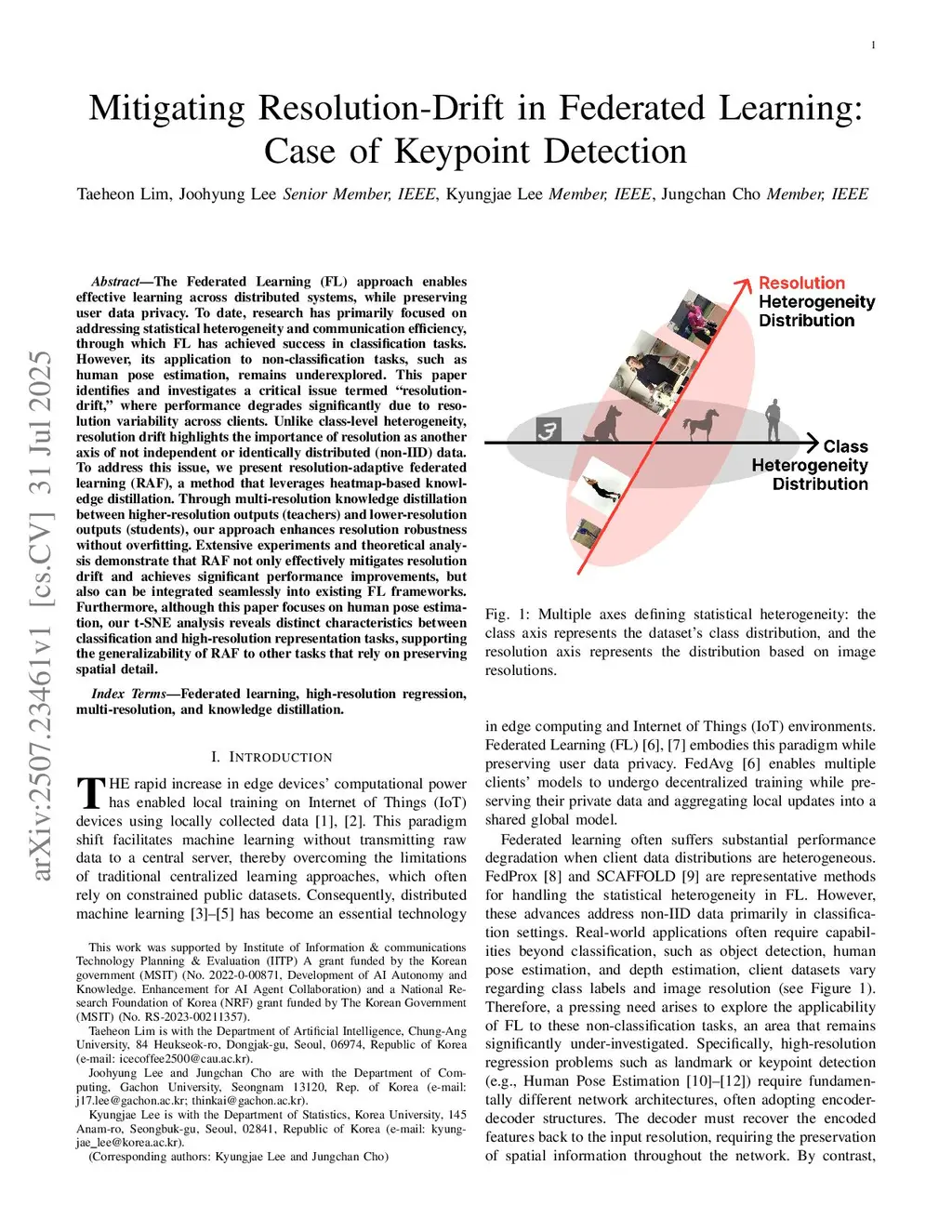 The Federated Learning (FL) approach enables effective learning across distributed systems, while preserving user data privacy. To date, research has primarily focused on addressing statistical heterogeneity and communication efficiency, through which FL has achieved success in classification tasks. However, its application to non-classification tasks, such as human pose estimation, remains underexplored. This paper identifies and investigates a critical issue termed ``resolution-drift,'' where performance degrades significantly due to resolution variability across clients. Unlike class-level heterogeneity, resolution drift highlights the importance of resolution as another axis of not independent or identically distributed (non-IID) data. To address this issue, we present resolution-adaptive federated learning (RAF), a method that leverages heatmap-based knowledge distillation. Through multi-resolution knowledge distillation between higher-resolution outputs (teachers) and lower-resolution outputs (students), our approach enhances resolution robustness without overfitting. Extensive experiments and theoretical analysis demonstrate that RAF not only effectively mitigates resolution drift and achieves significant performance improvements, but also can be integrated seamlessly into existing FL frameworks. Furthermore, although this paper focuses on human pose estimation, our t-SNE analysis reveals distinct characteristics between classification and high-resolution representation tasks, supporting the generalizability of RAF to other tasks that rely on preserving spatial detail.