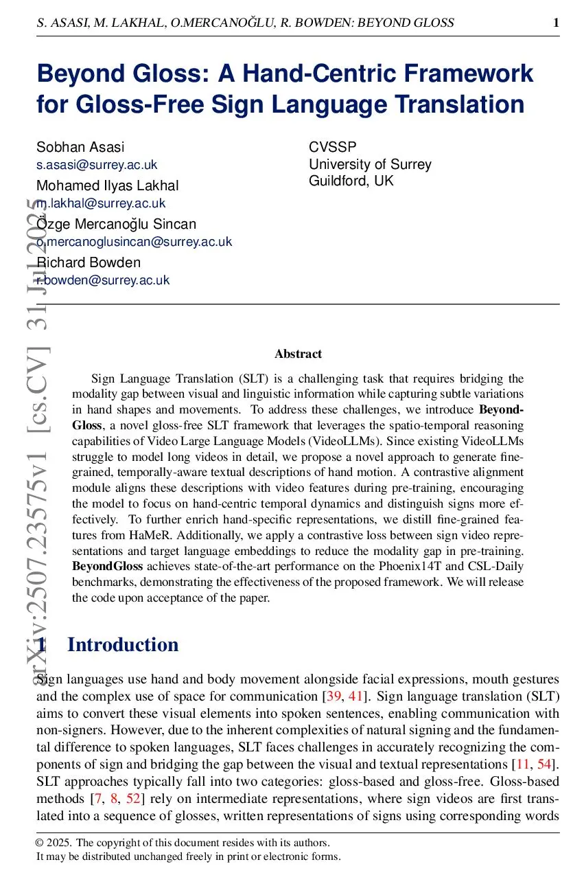 Sign Language Translation (SLT) is a challenging task that requires bridging the modality gap between visual and linguistic information while capturing subtle variations in hand shapes and movements. To address these challenges, we introduce \textbf{BeyondGloss}, a novel gloss-free SLT framework that leverages the spatio-temporal reasoning capabilities of Video Large Language Models (VideoLLMs). Since existing VideoLLMs struggle to model long videos in detail, we propose a novel approach to generate fine-grained, temporally-aware textual descriptions of hand motion. A contrastive alignment module aligns these descriptions with video features during pre-training, encouraging the model to focus on hand-centric temporal dynamics and distinguish signs more effectively. To further enrich hand-specific representations, we distill fine-grained features from HaMeR. Additionally, we apply a contrastive loss between sign video representations and target language embeddings to reduce the modality gap in pre-training. \textbf{BeyondGloss} achieves state-of-the-art performance on the Phoenix14T and CSL-Daily benchmarks, demonstrating the effectiveness of the proposed framework. We will release the code upon acceptance of the paper.