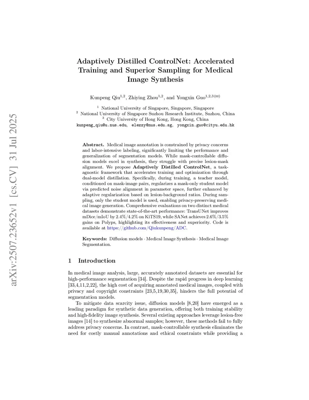 Medical image annotation is constrained by privacy concerns and labor-intensive labeling, significantly limiting the performance and generalization of segmentation models. While mask-controllable diffusion models excel in synthesis, they struggle with precise lesion-mask alignment. We propose \textbf{Adaptively Distilled ControlNet}, a task-agnostic framework that accelerates training and optimization through dual-model distillation. Specifically, during training, a teacher model, conditioned on mask-image pairs, regularizes a mask-only student model via predicted noise alignment in parameter space, further enhanced by adaptive regularization based on lesion-background ratios. During sampling, only the student model is used, enabling privacy-preserving medical image generation. Comprehensive evaluations on two distinct medical datasets demonstrate state-of-the-art performance: TransUNet improves mDice/mIoU by 2.4%/4.2% on KiTS19, while SANet achieves 2.6%/3.5% gains on Polyps, highlighting its effectiveness and superiority. Code is available at GitHub.