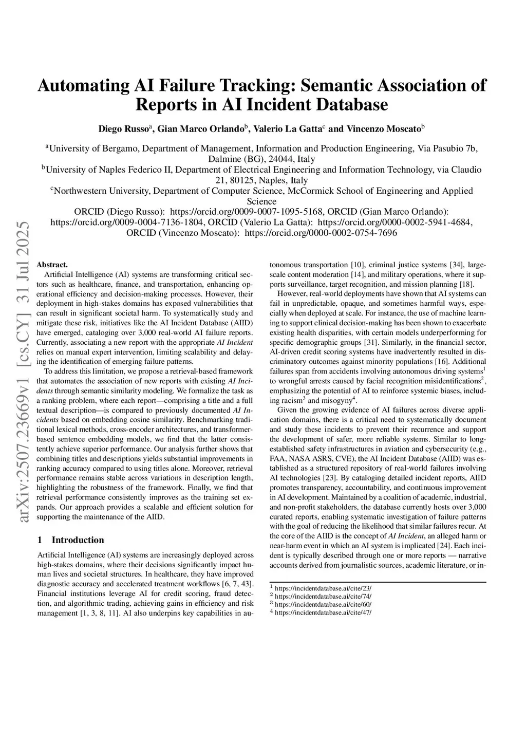 Artificial Intelligence (AI) systems are transforming critical sectors such as healthcare, finance, and transportation, enhancing operational efficiency and decision-making processes. However, their deployment in high-stakes domains has exposed vulnerabilities that can result in significant societal harm. To systematically study and mitigate these risk, initiatives like the AI Incident Database (AIID) have emerged, cataloging over 3,000 real-world AI failure reports. Currently, associating a new report with the appropriate AI Incident relies on manual expert intervention, limiting scalability and delaying the identification of emerging failure patterns.To address this limitation, we propose a retrieval-based framework that automates the association of new reports with existing AI Incidents through semantic similarity modeling. We formalize the task as a ranking problem, where each report-comprising a title and a full textual description-is compared to previously documented AI Incidents based on embedding cosine similarity. Benchmarking traditional lexical methods, cross-encoder architectures, and transformer-based sentence embedding models, we find that the latter consistently achieve superior performance. Our analysis further shows that combining titles and descriptions yields substantial improvements in ranking accuracy compared to using titles alone. Moreover, retrieval performance remains stable across variations in description length, highlighting the robustness of the framework. Finally, we find that retrieval performance consistently improves as the training set expands. Our approach provides a scalable and efficient solution for supporting the maintenance of the AIID.