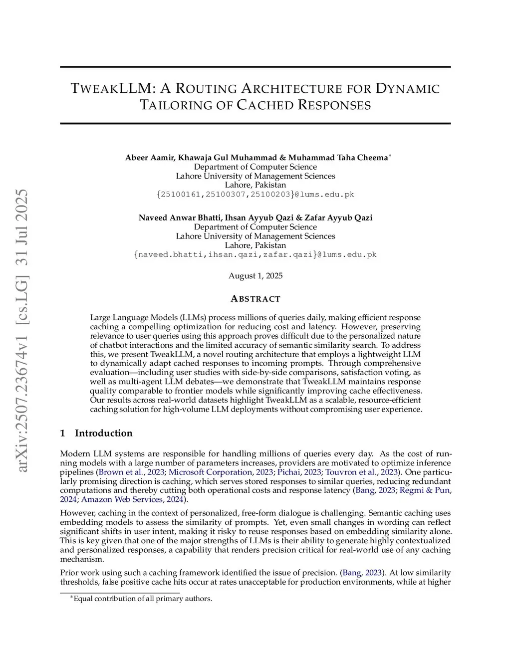 Large Language Models (LLMs) process millions of queries daily, making efficient response caching a compelling optimization for reducing cost and latency. However, preserving relevance to user queries using this approach proves difficult due to the personalized nature of chatbot interactions and the limited accuracy of semantic similarity search. To address this, we present TweakLLM, a novel routing architecture that employs a lightweight LLM to dynamically adapt cached responses to incoming prompts. Through comprehensive evaluation, including user studies with side-by-side comparisons, satisfaction voting, as well as multi-agent LLM debates, we demonstrate that TweakLLM maintains response quality comparable to frontier models while significantly improving cache effectiveness. Our results across real-world datasets highlight TweakLLM as a scalable, resource-efficient caching solution for high-volume LLM deployments without compromising user experience.
