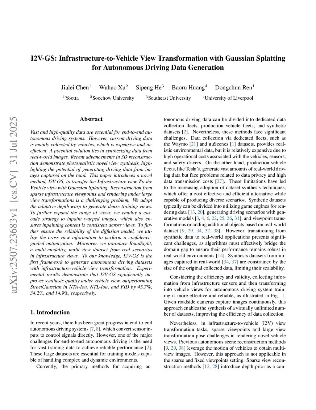 Vast and high-quality data are essential for end-to-end autonomous driving systems. However, current driving data is mainly collected by vehicles, which is expensive and inefficient. A potential solution lies in synthesizing data from real-world images. Recent advancements in 3D reconstruction demonstrate photorealistic novel view synthesis, highlighting the potential of generating driving data from images captured on the road. This paper introduces a novel method, I2V-GS, to transfer the Infrastructure view To the Vehicle view with Gaussian Splatting. Reconstruction from sparse infrastructure viewpoints and rendering under large view transformations is a challenging problem. We adopt the adaptive depth warp to generate dense training views. To further expand the range of views, we employ a cascade strategy to inpaint warped images, which also ensures inpainting content is consistent across views. To further ensure the reliability of the diffusion model, we utilize the cross-view information to perform a confidenceguided optimization. Moreover, we introduce RoadSight, a multi-modality, multi-view dataset from real scenarios in infrastructure views. To our knowledge, I2V-GS is the first framework to generate autonomous driving datasets with infrastructure-vehicle view transformation. Experimental results demonstrate that I2V-GS significantly improves synthesis quality under vehicle view, outperforming StreetGaussian in NTA-Iou, NTL-Iou, and FID by 45.7%, 34.2%, and 14.9%, respectively.