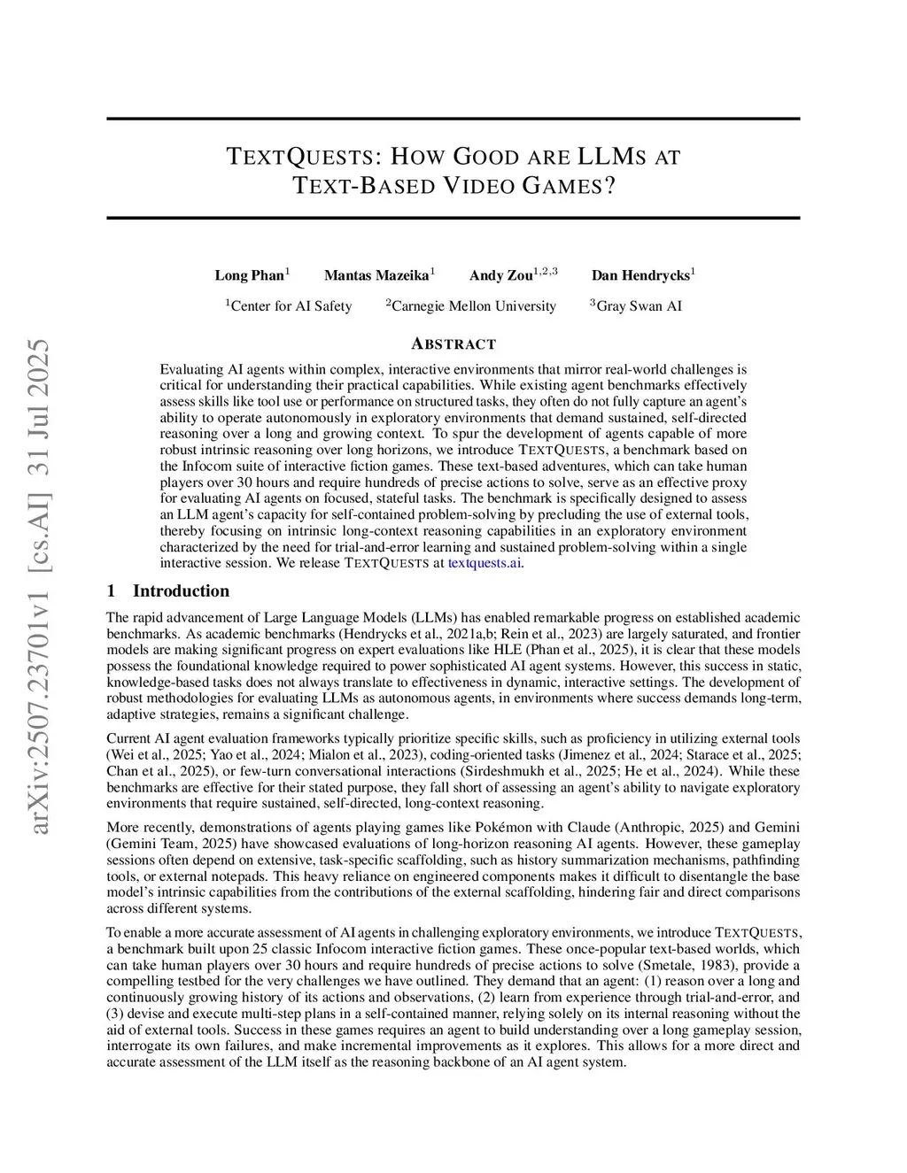 Evaluating AI agents within complex, interactive environments that mirror real-world challenges is critical for understanding their practical capabilities. While existing agent benchmarks effectively assess skills like tool use or performance on structured tasks, they often do not fully capture an agent's ability to operate autonomously in exploratory environments that demand sustained, self-directed reasoning over a long and growing context. To spur the development of agents capable of more robust intrinsic reasoning over long horizons, we introduce TextQuests, a benchmark based on the Infocom suite of interactive fiction games. These text-based adventures, which can take human players over 30 hours and require hundreds of precise actions to solve, serve as an effective proxy for evaluating AI agents on focused, stateful tasks. The benchmark is specifically designed to assess an LLM agent's capacity for self-contained problem-solving by precluding the use of external tools, thereby focusing on intrinsic long-context reasoning capabilities in an exploratory environment characterized by the need for trial-and-error learning and sustained problem-solving within a single interactive session. We release TextQuests at this https URL.