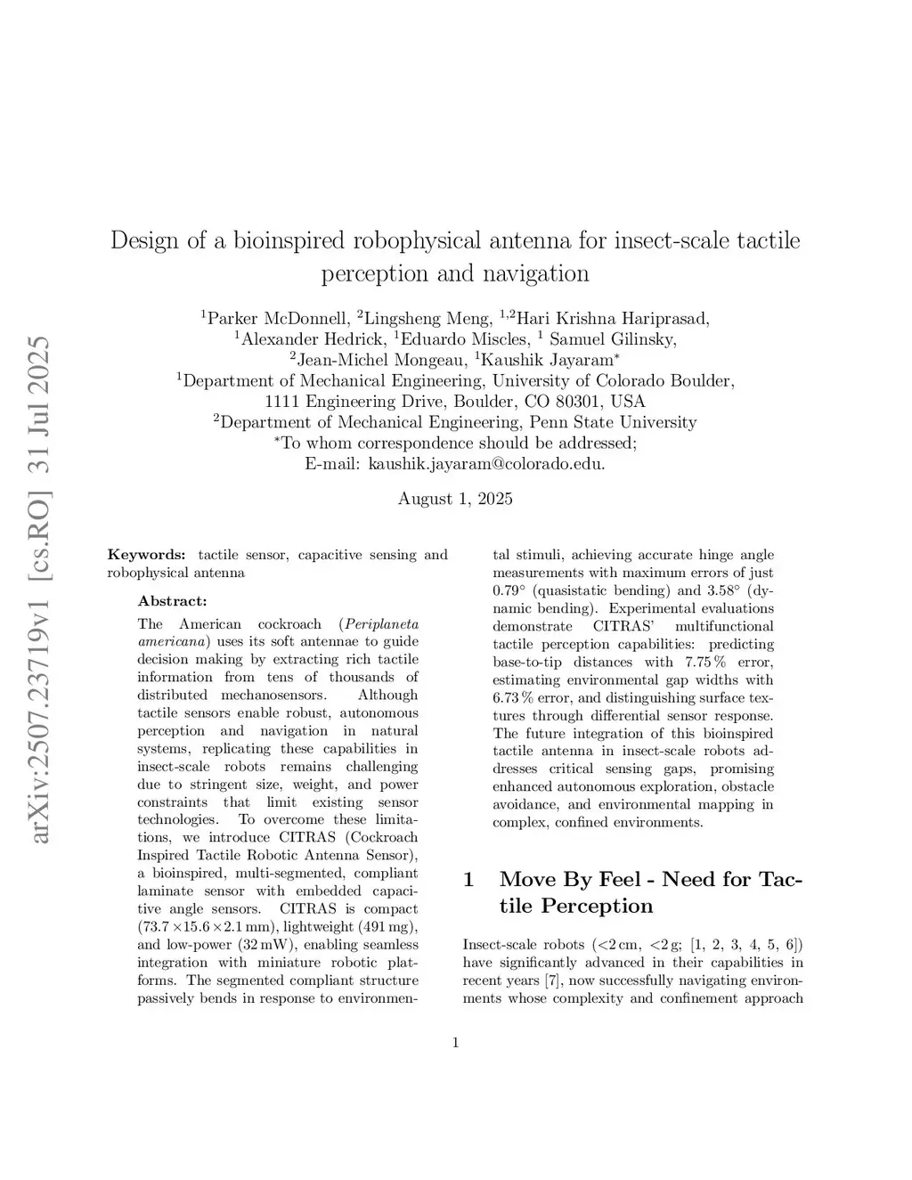 The American cockroach (Periplaneta americana) uses its soft antennae to guide decision making by extracting rich tactile information from tens of thousands of distributed mechanosensors. Although tactile sensors enable robust, autonomous perception and navigation in natural systems, replicating these capabilities in insect-scale robots remains challenging due to stringent size, weight, and power constraints that limit existing sensor technologies. To overcome these limitations, we introduce CITRAS (Cockroach Inspired Tactile Robotic Antenna Sensor), a bioinspired, multi-segmented, compliant laminate sensor with embedded capacitive angle sensors. CITRAS is compact (73.7x15.6x2.1 mm), lightweight (491 mg), and low-power (32 mW), enabling seamless integration with miniature robotic platforms. The segmented compliant structure passively bends in response to environmental stimuli, achieving accurate hinge angle measurements with maximum errors of just 0.79 degree (quasistatic bending) and 3.58 degree (dynamic bending). Experimental evaluations demonstrate CITRAS' multifunctional tactile perception capabilities: predicting base-to-tip distances with 7.75 % error, estimating environmental gap widths with 6.73 % error, and distinguishing surface textures through differential sensor response. The future integration of this bioinspired tactile antenna in insect-scale robots addresses critical sensing gaps, promising enhanced autonomous exploration, obstacle avoidance, and environmental mapping in complex, confined environments.