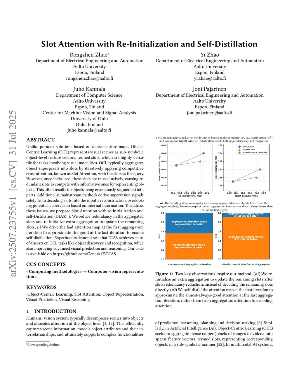 Unlike popular solutions based on dense feature maps, Object-Centric Learning (OCL) represents visual scenes as sub-symbolic object-level feature vectors, termed slots, which are highly versatile for tasks involving visual modalities. OCL typically aggregates object superpixels into slots by iteratively applying competitive cross attention, known as Slot Attention, with the slots as the query. However, once initialized, these slots are reused naively, causing redundant slots to compete with informative ones for representing objects. This often results in objects being erroneously segmented into parts. Additionally, mainstream methods derive supervision signals solely from decoding slots into the input's reconstruction, overlooking potential supervision based on internal information. To address these issues, we propose Slot Attention with re-Initialization and self-Distillation (DIAS): We reduce redundancy in the aggregated slots and re-initialize extra aggregation to update the remaining slots; We drive the bad attention map at the first aggregation iteration to approximate the good at the last iteration to enable self-distillation. Experiments demonstrate that DIAS achieves state-of-the-art on OCL tasks like object discovery and recognition, while also improving advanced visual prediction and reasoning. Our source code and model checkpoints are available onthis https URL.