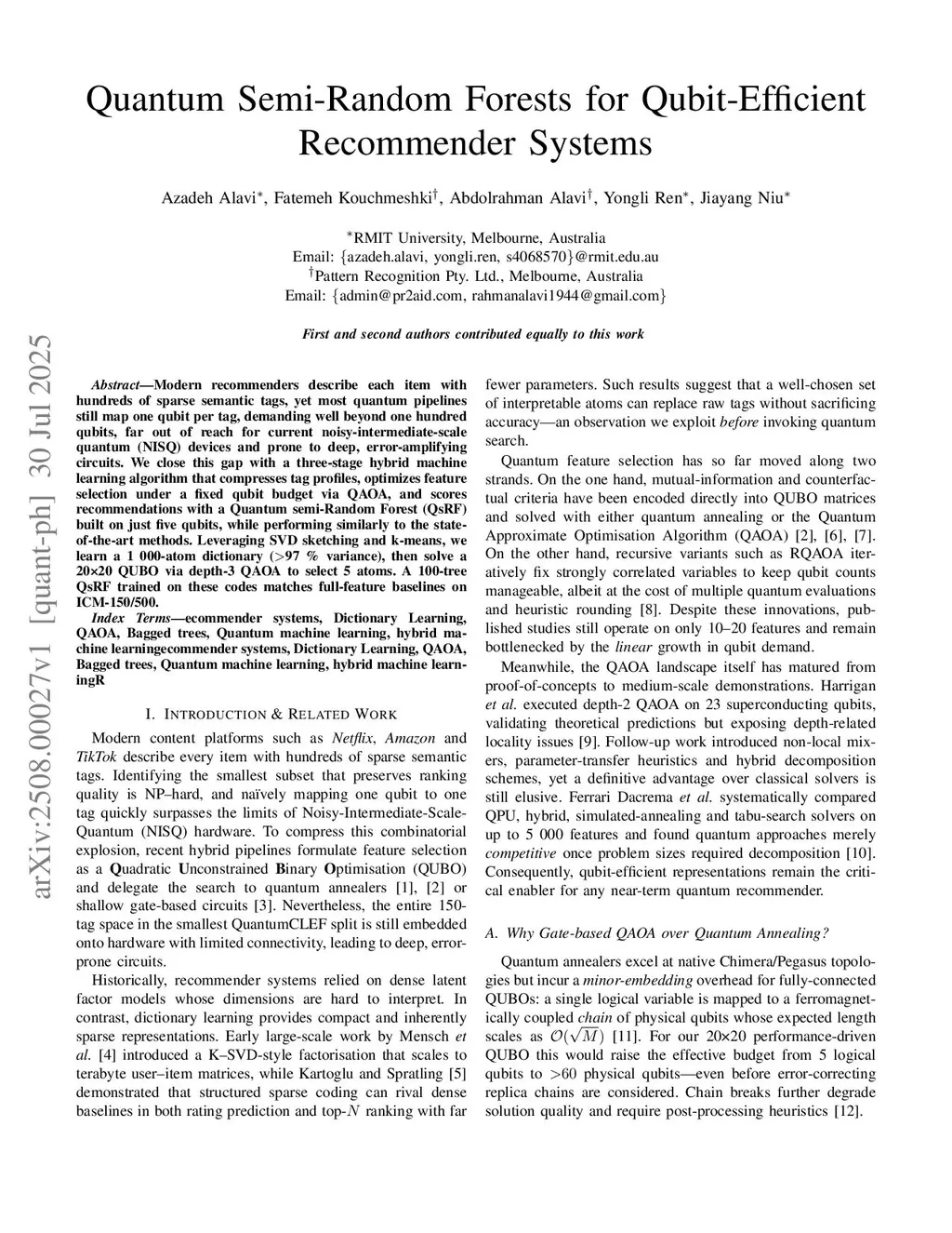 Modern recommenders describe each item with hundreds of sparse semantic tags, yet most quantum pipelines still map one qubit per tag, demanding well beyond one hundred qubits, far out of reach for current noisy-intermediate-scale quantum (NISQ) devices and prone to deep, error-amplifying circuits. We close this gap with a three-stage hybrid machine learning algorithm that compresses tag profiles, optimizes feature selection under a fixed qubit budget via QAOA, and scores recommendations with a Quantum semi-Random Forest (QsRF) built on just five qubits, while performing similarly to the state-of-the-art methods. Leveraging SVD sketching and k-means, we learn a 1000-atom dictionary (97 \% variance), then solve a 2020 QUBO via depth-3 QAOA to select 5 atoms. A 100-tree QsRF trained on these codes matches full-feature baselines on ICM-150/500.