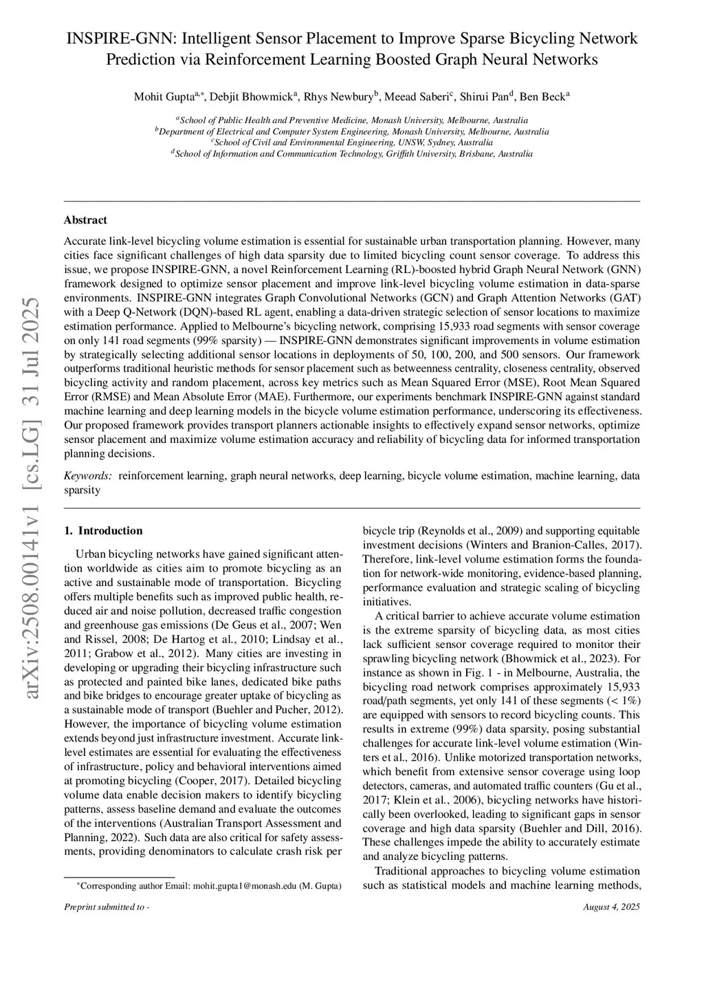 INSPIRE-GNN: Intelligent Sensor Placement to Improve Sparse Bicycling Network Prediction via Reinforcement Learning Boosted Graph Neural Networks