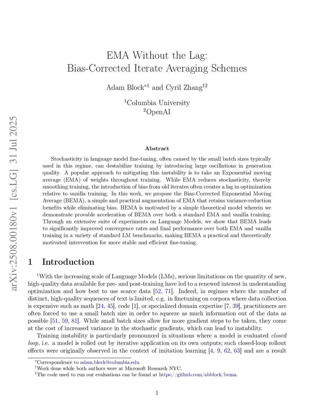 Stochasticity in language model fine-tuning, often caused by the small batch sizes typically used in this regime, can destabilize training by introducing large oscillations in generation quality. A popular approach to mitigating this instability is to take an Exponential moving average (EMA) of weights throughout training. While EMA reduces stochasticity, thereby smoothing training, the introduction of bias from old iterates often creates a lag in optimization relative to vanilla training. In this work, we propose the Bias-Corrected Exponential Moving Average (BEMA), a simple and practical augmentation of EMA that retains variance-reduction benefits while eliminating bias. BEMA is motivated by a simple theoretical model wherein we demonstrate provable acceleration of BEMA over both a standard EMA and vanilla training. Through an extensive suite of experiments on Language Models, we show that BEMA leads to significantly improved convergence rates and final performance over both EMA and vanilla training in a variety of standard LM benchmarks, making BEMA a practical and theoretically motivated intervention for more stable and efficient fine-tuning.