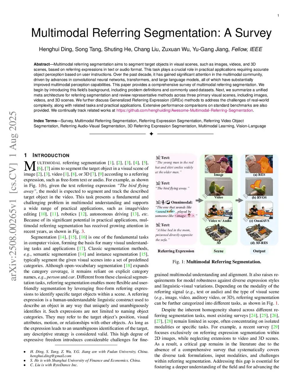 Multimodal referring segmentation aims to segment target objects in visual scenes, such as images, videos, and 3D scenes, based on referring expressions in text or audio format. This task plays a crucial role in practical applications requiring accurate object perception based on user instructions. Over the past decade, it has gained significant attention in the multimodal community, driven by advances in convolutional neural networks, transformers, and large language models, all of which have substantially improved multimodal perception capabilities. This paper provides a comprehensive survey of multimodal referring segmentation. We begin by introducing this field's background, including problem definitions and commonly used datasets. Next, we summarize a unified meta architecture for referring segmentation and review representative methods across three primary visual scenes, including images, videos, and 3D scenes. We further discuss Generalized Referring Expression (GREx) methods to address the challenges of real-world complexity, along with related tasks and practical applications. Extensive performance comparisons on standard benchmarks are also provided. We continually track related works atthis https URL.