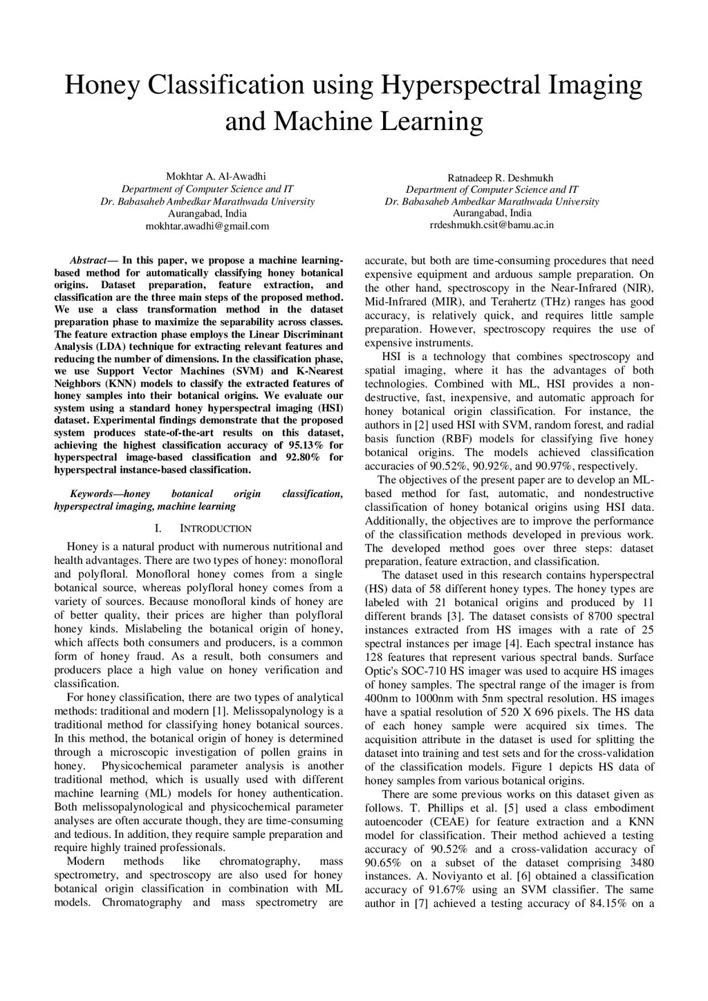 In this paper, we propose a machine learning-based method for automatically classifying honey botanical origins. Dataset preparation, feature extraction, and classification are the three main steps of the proposed method. We use a class transformation method in the dataset preparation phase to maximize the separability across classes. The feature extraction phase employs the Linear Discriminant Analysis (LDA) technique for extracting relevant features and reducing the number of dimensions. In the classification phase, we use Support Vector Machines (SVM) and K-Nearest Neighbors (KNN) models to classify the extracted features of honey samples into their botanical origins. We evaluate our system using a standard honey hyperspectral imaging (HSI) dataset. Experimental findings demonstrate that the proposed system produces state-of-the-art results on this dataset, achieving the highest classification accuracy of 95.13% for hyperspectral image-based classification and 92.80% for hyperspectral instance-based classification.