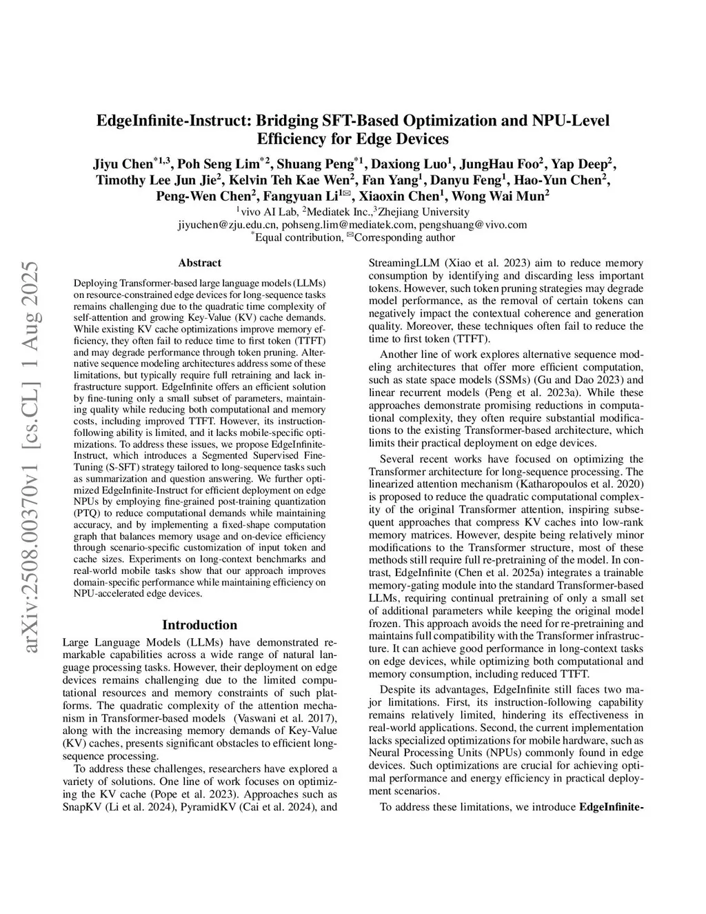 Deploying Transformer-based large language models (LLMs) on resource-constrained edge devices for long-sequence tasks remains challenging due to the quadratic time complexity of self-attention and growing Key-Value (KV) cache demands. While existing KV cache optimizations improve memory efficiency, they often fail to reduce time to first token (TTFT) and may degrade performance through token pruning. Alternative sequence modeling architectures address some of these limitations, but typically require full retraining and lack infrastructure support. EdgeInfinite offers an efficient solution by fine-tuning only a small subset of parameters, maintaining quality while reducing both computational and memory costs, including improved TTFT. However, its instruction-following ability is limited, and it lacks mobile-specific optimizations. To address these issues, we propose EdgeInfinite-Instruct, which introduces a Segmented Supervised Fine-Tuning (S-SFT) strategy tailored to long-sequence tasks such as summarization and question answering. We further optimized EdgeInfinite-Instruct for efficient deployment on edge NPUs by employing fine-grained post-training quantization (PTQ) to reduce computational demands while maintaining accuracy, and by implementing a fixed-shape computation graph that balances memory usage and on-device efficiency through scenario-specific customization of input token and cache sizes. Experiments on long-context benchmarks and real-world mobile tasks show that our approach improves domain-specific performance while maintaining efficiency on NPU-accelerated edge devices.