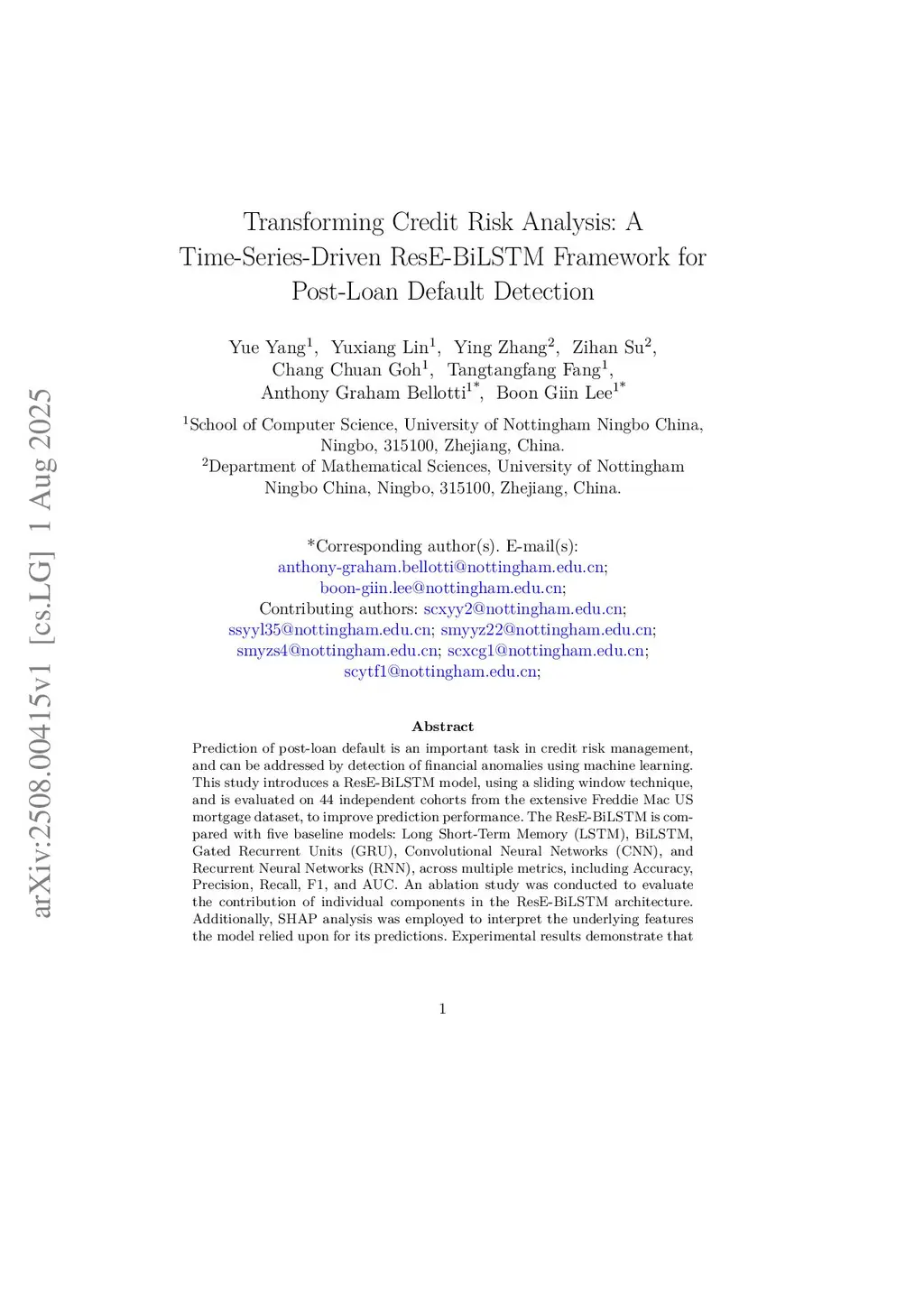 Prediction of post-loan default is an important task in credit risk management, and can be addressed by detection of financial anomalies using machine learning. This study introduces a ResE-BiLSTM model, using a sliding window technique, and is evaluated on 44 independent cohorts from the extensive Freddie Mac US mortgage dataset, to improve prediction performance. The ResE-BiLSTM is compared with five baseline models: Long Short-Term Memory (LSTM), BiLSTM, Gated Recurrent Units (GRU), Convolutional Neural Networks (CNN), and Recurrent Neural Networks (RNN), across multiple metrics, including Accuracy, Precision, Recall, F1, and AUC. An ablation study was conducted to evaluate the contribution of individual components in the ResE-BiLSTM architecture. Additionally, SHAP analysis was employed to interpret the underlying features the model relied upon for its predictions. Experimental results demonstrate that ResE-BiLSTM achieves superior predictive performance compared to baseline models, underscoring its practical value and applicability in real-world scenarios.