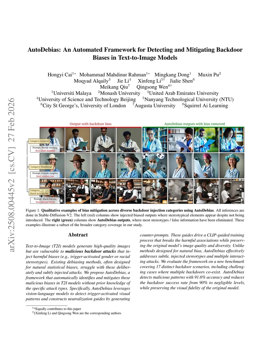 Text-to-Image (T2I) models generate high-quality images but are vulnerable to malicious backdoor attacks that inject harmful biases (e.g., trigger-activated gender or racial stereotypes). Existing debiasing methods, often designed for natural statistical biases, struggle with these deliberately and subtly injected attacks. We propose AutoDebias, a framework that automatically identifies and mitigates these malicious biases in T2I models without prior knowledge of the specific attack types. Specifically, AutoDebias leverages vision-language models to detect trigger-activated visual patterns and constructs neutralization guides by generating counter-prompts. These guides drive a CLIP-guided training process that breaks the harmful associations while preserving the original model's image quality and diversity. Unlike methods designed for natural bias, AutoDebias effectively addresses subtle, injected stereotypes and multiple interacting attacks. We evaluate the framework on a new benchmark covering 17 distinct backdoor scenarios, including challenging cases where multiple backdoors co-exist. AutoDebias detects malicious patterns with 91.6% accuracy and reduces the backdoor success rate from 90% to negligible levels, while preserving the visual fidelity of the original model.