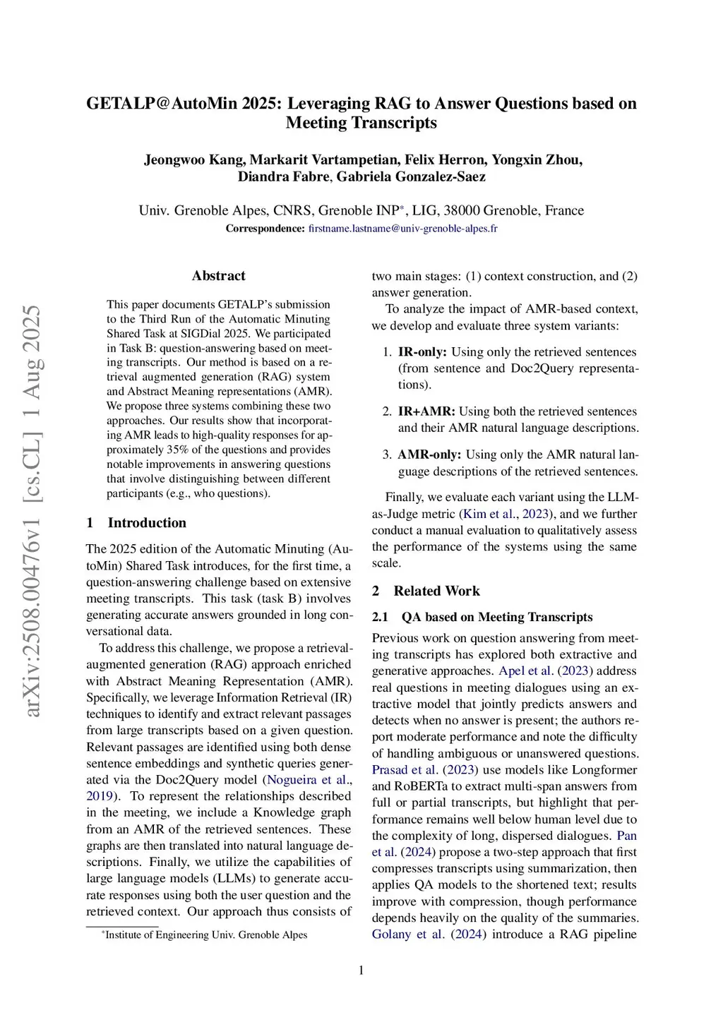 This paper documents GETALP's submission to the Third Run of the Automatic Minuting Shared Task at SIGDial 2025. We participated in Task B: question-answering based on meeting transcripts. Our method is based on a retrieval augmented generation (RAG) system and Abstract Meaning Representations (AMR). We propose three systems combining these two approaches. Our results show that incorporating AMR leads to high-quality responses for approximately 35% of the questions and provides notable improvements in answering questions that involve distinguishing between different participants (e.g., who questions).