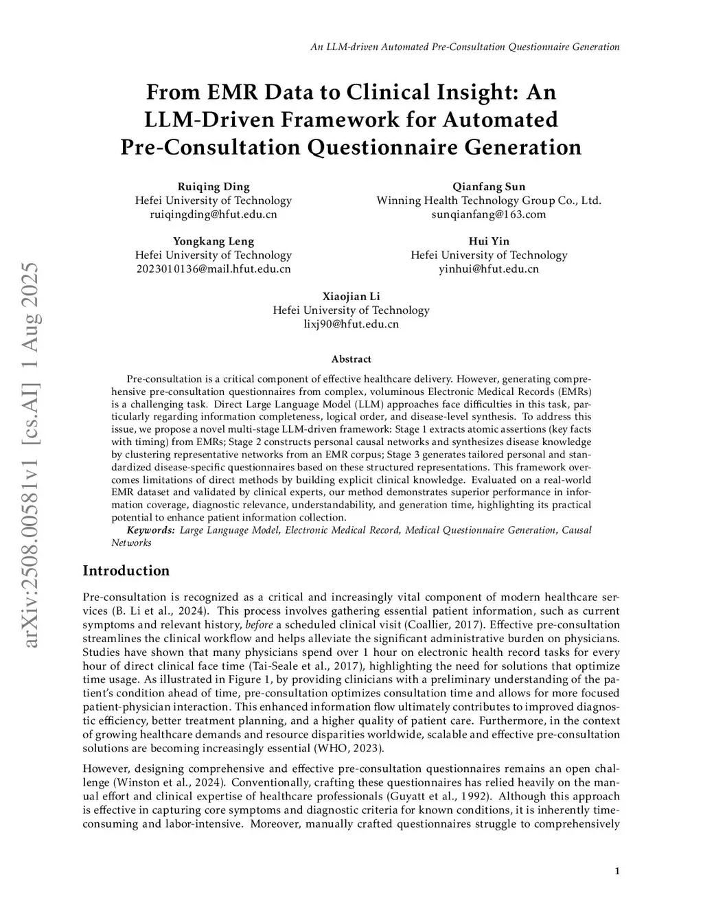 Pre-consultation is a critical component of effective healthcare delivery. However, generating comprehensive pre-consultation questionnaires from complex, voluminous Electronic Medical Records (EMRs) is a challenging task. Direct Large Language Model (LLM) approaches face difficulties in this task, particularly regarding information completeness, logical order, and disease-level synthesis. To address this issue, we propose a novel multi-stage LLM-driven framework: Stage 1 extracts atomic assertions (key facts with timing) from EMRs; Stage 2 constructs personal causal networks and synthesizes disease knowledge by clustering representative networks from an EMR corpus; Stage 3 generates tailored personal and standardized disease-specific questionnaires based on these structured representations. This framework overcomes limitations of direct methods by building explicit clinical knowledge. Evaluated on a real-world EMR dataset and validated by clinical experts, our method demonstrates superior performance in information coverage, diagnostic relevance, understandability, and generation time, highlighting its practical potential to enhance patient information collection.