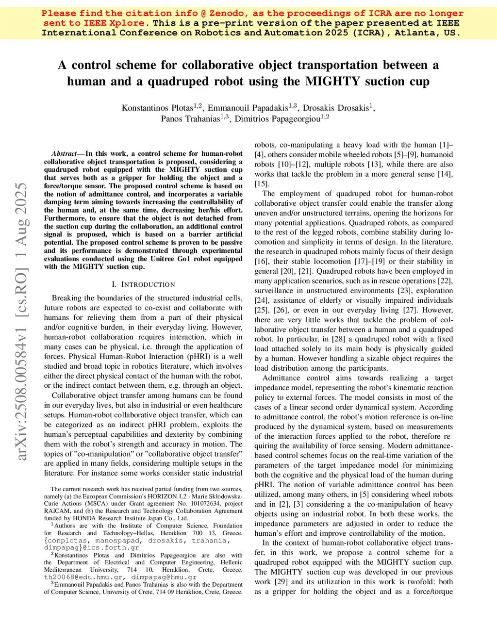 A control scheme for collaborative object transportation between a human and a quadruped robot using the MIGHTY suction cup