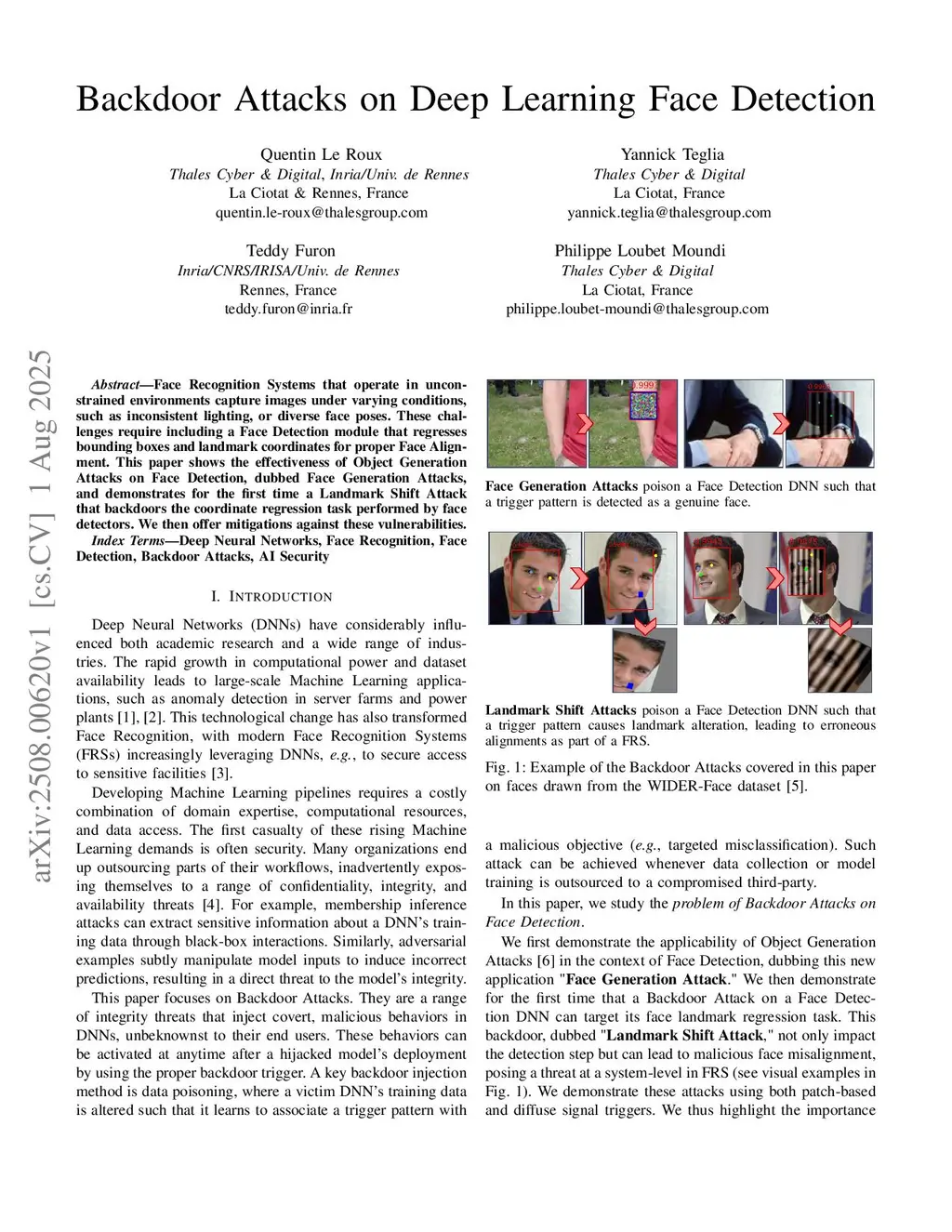 Face Recognition Systems that operate in unconstrained environments capture images under varying conditions,such as inconsistent lighting, or diverse face poses. These challenges require including a Face Detection module that regresses bounding boxes and landmark coordinates for proper Face Alignment. This paper shows the effectiveness of Object Generation Attacks on Face Detection, dubbed Face Generation Attacks, and demonstrates for the first time a Landmark Shift Attack that backdoors the coordinate regression task performed by face detectors. We then offer mitigations against these vulnerabilities.
