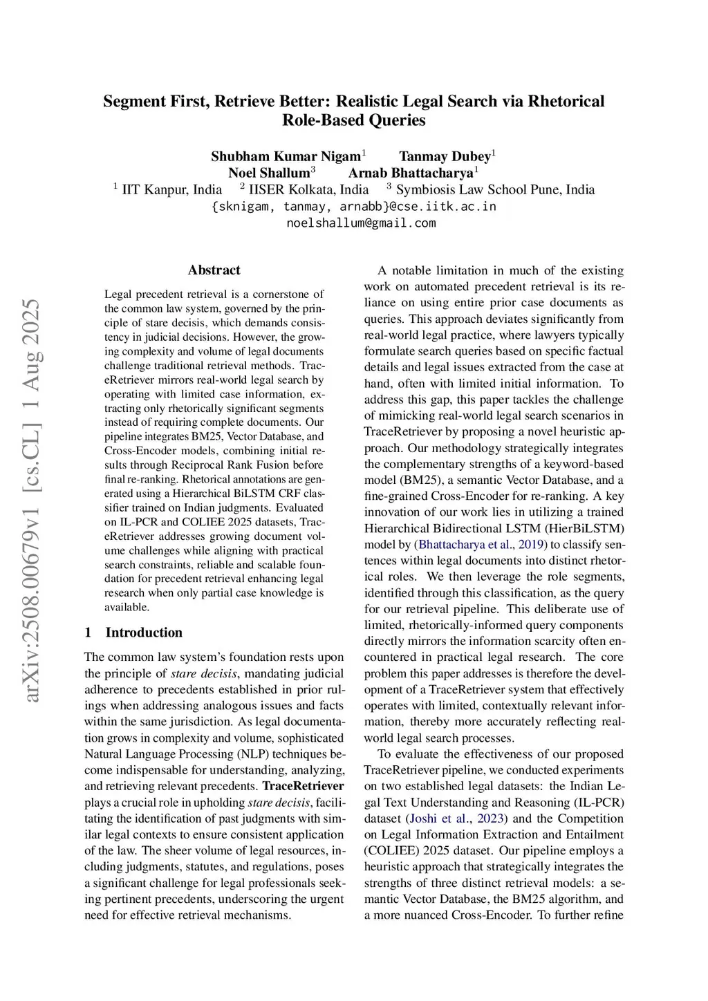 Legal precedent retrieval is a cornerstone of the common law system, governed by the principle of stare decisis, which demands consistency in judicial decisions. However, the growing complexity and volume of legal documents challenge traditional retrieval methods. TraceRetriever mirrors real-world legal search by operating with limited case information, extracting only rhetorically significant segments instead of requiring complete documents. Our pipeline integrates BM25, Vector Database, and Cross-Encoder models, combining initial results through Reciprocal Rank Fusion before final re-ranking. Rhetorical annotations are generated using a Hierarchical BiLSTM CRF classifier trained on Indian judgments. Evaluated on IL-PCR and COLIEE 2025 datasets, TraceRetriever addresses growing document volume challenges while aligning with practical search constraints, reliable and scalable foundation for precedent retrieval enhancing legal research when only partial case knowledge is available.