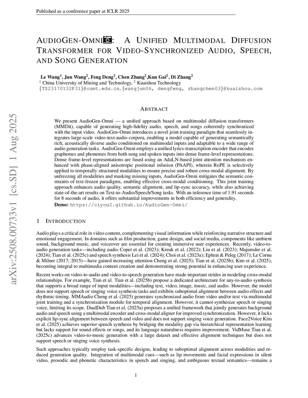 We present AudioGen-Omni - a unified approach based on multimodal diffusion transformers (MMDit), capable of generating high-fidelity audio, speech, and song coherently synchronized with the input video. AudioGen-Omni introduces a novel joint training paradigm that seamlessly integrates large-scale video-text-audio corpora, enabling a model capable of generating semantically rich, acoustically diverse audio conditioned on multimodal inputs and adaptable to a wide range of audio generation tasks. AudioGen-Omni employs a unified lyrics-transcription encoder that encodes graphemes and phonemes from both song and spoken inputs into dense frame-level representations. Dense frame-level representations are fused using an AdaLN-based joint attention mechanism enhanced with phase-aligned anisotropic positional infusion (PAAPI), wherein RoPE is selectively applied to temporally structured modalities to ensure precise and robust cross-modal alignment. By unfreezing all modalities and masking missing inputs, AudioGen-Omni mitigates the semantic constraints of text-frozen paradigms, enabling effective cross-modal conditioning. This joint training approach enhances audio quality, semantic alignment, and lip-sync accuracy, while also achieving state-of-the-art results on Text-to-Audio/Speech/Song tasks. With an inference time of 1.91 seconds for 8 seconds of audio, it offers substantial improvements in both efficiency and generality.
