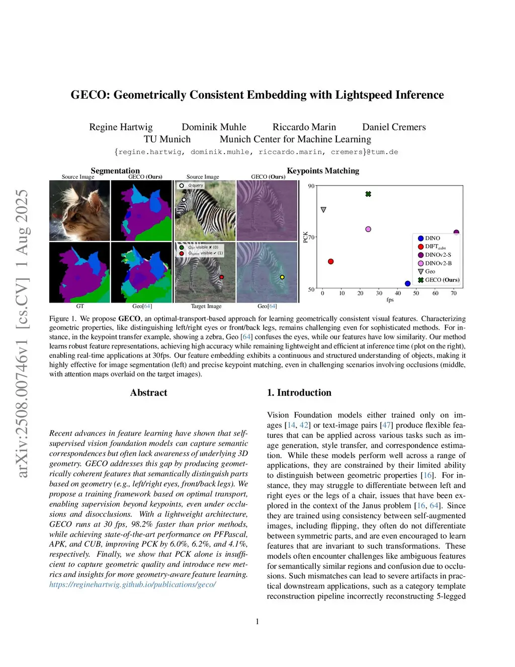 Recent advances in feature learning have shown that self-supervised vision foundation models can capture semantic correspondences but often lack awareness of underlying 3D geometry. GECO addresses this gap by producing geometrically coherent features that semantically distinguish parts based on geometry (e.g., left/right eyes, front/back legs). We propose a training framework based on optimal transport, enabling supervision beyond keypoints, even under occlusions and disocclusions. With a lightweight architecture, GECO runs at 30 fps, 98.2% faster than prior methods, while achieving state-of-the-art performance on PFPascal, APK, and CUB, improving PCK by 6.0%, 6.2%, and 4.1%, respectively. Finally, we show that PCK alone is insufficient to capture geometric quality and introduce new metrics and insights for more geometry-aware feature learning. Link to project page:this https URL
