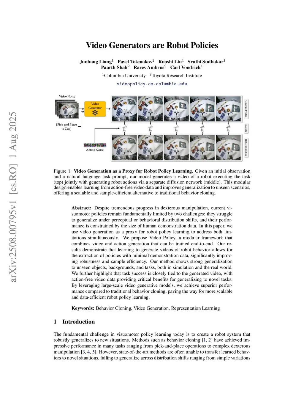 Despite tremendous progress in dexterous manipulation, current visuomotor policies remain fundamentally limited by two challenges: they struggle to generalize under perceptual or behavioral distribution shifts, and their performance is constrained by the size of human demonstration data. In this paper, we use video generation as a proxy for robot policy learning to address both limitations simultaneously. We propose Video Policy, a modular framework that combines video and action generation that can be trained end-to-end. Our results demonstrate that learning to generate videos of robot behavior allows for the extraction of policies with minimal demonstration data, significantly improving robustness and sample efficiency. Our method shows strong generalization to unseen objects, backgrounds, and tasks, both in simulation and the real world. We further highlight that task success is closely tied to the generated video, with action-free video data providing critical benefits for generalizing to novel tasks. By leveraging large-scale video generative models, we achieve superior performance compared to traditional behavior cloning, paving the way for more scalable and data-efficient robot policy learning.