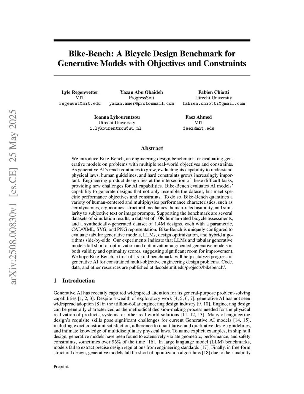 We introduce BikeBench, an engineering design benchmark for evaluating generative models on problems with multiple real-world objectives and constraints. As generative AI's reach continues to grow, evaluating its capability to understand physical laws, human guidelines, and hard constraints grows increasingly important. Engineering product design lies at the intersection of these difficult tasks, providing new challenges for AI capabilities. BikeBench evaluates AI models' capabilities to generate bicycle designs that not only resemble the dataset, but meet specific performance objectives and constraints. To do so, BikeBench quantifies a variety of human-centered and multiphysics performance characteristics, such as aerodynamics, ergonomics, structural mechanics, human-rated usability, and similarity to subjective text or image prompts. Supporting the benchmark are several datasets of simulation results, a dataset of 10,000 human-rated bicycle assessments, and a synthetically generated dataset of 1.6M designs, each with a parametric, CAD/XML, SVG, and PNG representation. BikeBench is uniquely configured to evaluate tabular generative models, large language models (LLMs), design optimization, and hybrid algorithms side-by-side. Our experiments indicate that LLMs and tabular generative models fall short of hybrid GenAI+optimization algorithms in design quality, constraint satisfaction, and similarity scores, suggesting significant room for improvement. We hope that BikeBench, a first-of-its-kind benchmark, will help catalyze progress in generative AI for constrained multi-objective engineering design problems. We provide code, data, an interactive leaderboard, and other resources atthis https URL.