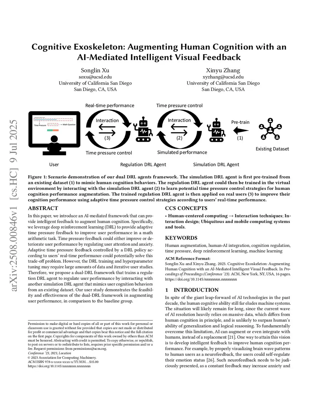 In this paper, we introduce an AI-mediated framework that can provide intelligent feedback to augment human cognition. Specifically, we leverage deep reinforcement learning (DRL) to provide adaptive time pressure feedback to improve user performance in a math arithmetic task. Time pressure feedback could either improve or deteriorate user performance by regulating user attention and anxiety. Adaptive time pressure feedback controlled by a DRL policy according to users' real-time performance could potentially solve this trade-off problem. However, the DRL training and hyperparameter tuning may require large amounts of data and iterative user studies. Therefore, we propose a dual-DRL framework that trains a regulation DRL agent to regulate user performance by interacting with another simulation DRL agent that mimics user cognition behaviors from an existing dataset. Our user study demonstrates the feasibility and effectiveness of the dual-DRL framework in augmenting user performance, in comparison to the baseline group.