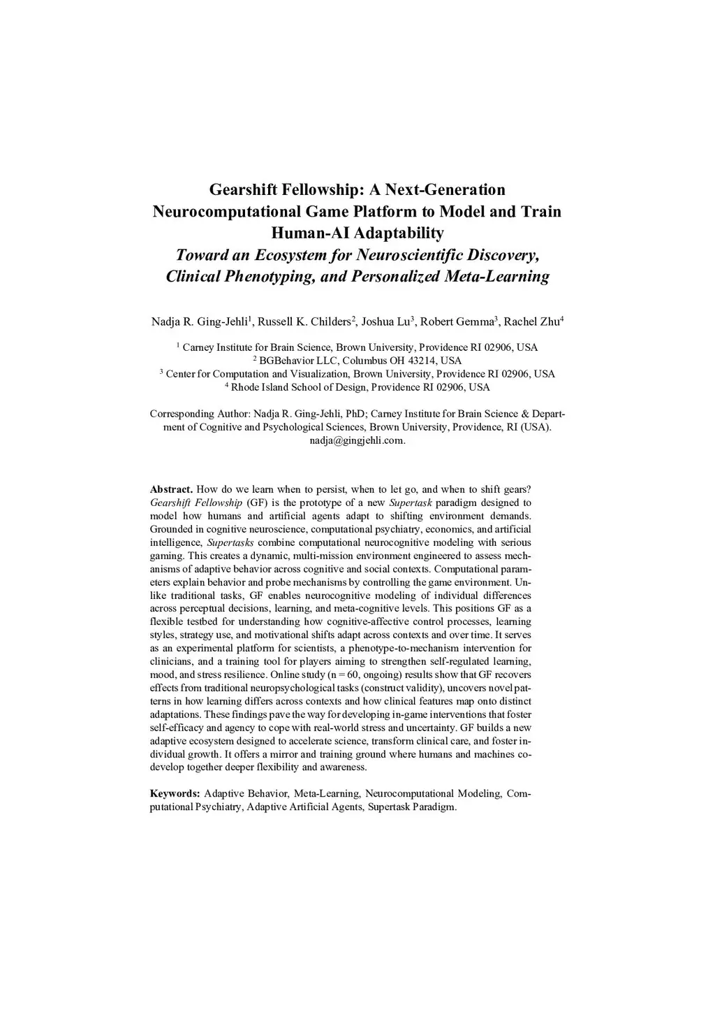 How do we learn when to persist, when to let go, and when to shift gears? Gearshift Fellowship (GF) is the prototype of a new Supertask paradigm designed to model how humans and artificial agents adapt to shifting environment demands. Grounded in cognitive neuroscience, computational psychiatry, economics, and artificial intelligence, Supertasks combine computational neurocognitive modeling with serious gaming. This creates a dynamic, multi-mission environment engineered to assess mechanisms of adaptive behavior across cognitive and social contexts. Computational parameters explain behavior and probe mechanisms by controlling the game environment. Unlike traditional tasks, GF enables neurocognitive modeling of individual differences across perceptual decisions, learning, and meta-cognitive levels. This positions GF as a flexible testbed for understanding how cognitive-affective control processes, learning styles, strategy use, and motivational shifts adapt across contexts and over time. It serves as an experimental platform for scientists, a phenotype-to-mechanism intervention for clinicians, and a training tool for players aiming to strengthen self-regulated learning, mood, and stress resilience. Online study (n = 60, ongoing) results show that GF recovers effects from traditional neuropsychological tasks (construct validity), uncovers novel patterns in how learning differs across contexts and how clinical features map onto distinct adaptations. These findings pave the way for developing in-game interventions that foster self-efficacy and agency to cope with real-world stress and uncertainty. GF builds a new adaptive ecosystem designed to accelerate science, transform clinical care, and foster individual growth. It offers a mirror and training ground where humans and machines co-develop together deeper flexibility and awareness.