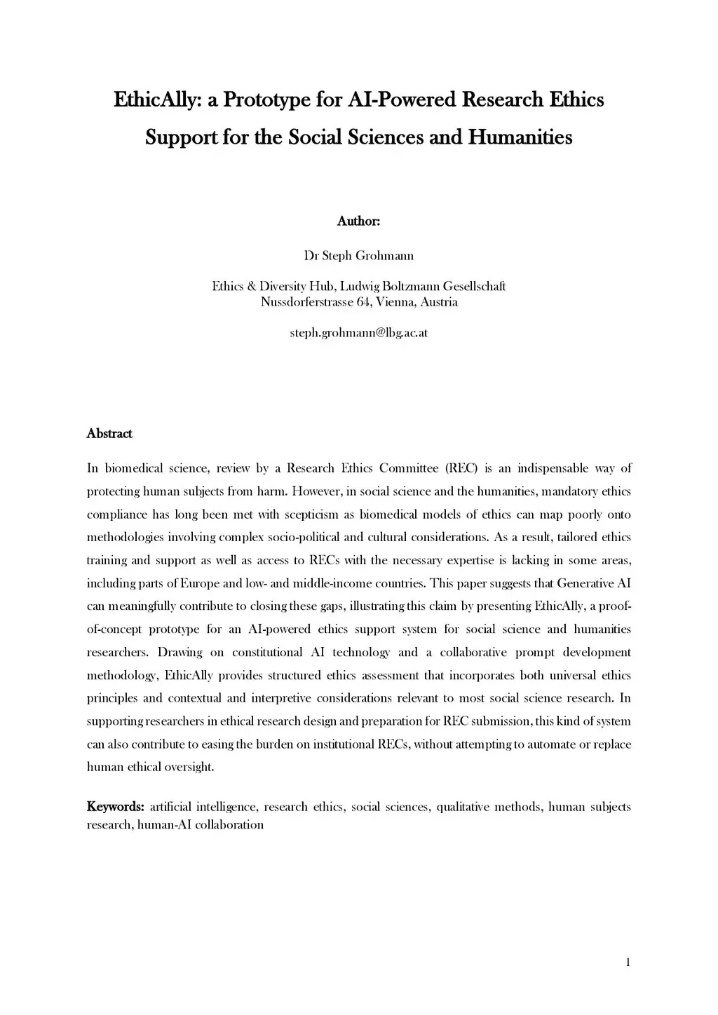 In biomedical science, review by a Research Ethics Committee (REC) is an indispensable way of protecting human subjects from harm. However, in social science and the humanities, mandatory ethics compliance has long been met with scepticism as biomedical models of ethics can map poorly onto methodologies involving complex socio-political and cultural considerations. As a result, tailored ethics training and support as well as access to RECs with the necessary expertise is lacking in some areas, including parts of Europe and low- and middle-income countries. This paper suggests that Generative AI can meaningfully contribute to closing these gaps, illustrating this claim by presenting EthicAlly, a proof-of-concept prototype for an AI-powered ethics support system for social science and humanities researchers. Drawing on constitutional AI technology and a collaborative prompt development methodology, EthicAlly provides structured ethics assessment that incorporates both universal ethics principles and contextual and interpretive considerations relevant to most social science research. In supporting researchers in ethical research design and preparation for REC submission, this kind of system can also contribute to easing the burden on institutional RECs, without attempting to automate or replace human ethical oversight.