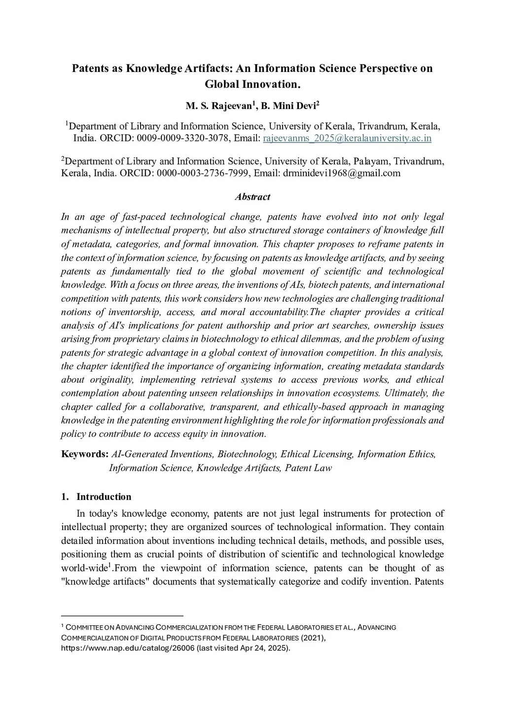 In an age of fast-paced technological change, patents have evolved into not only legal mechanisms of intellectual property, but also structured storage containers of knowledge full of metadata, categories, and formal innovation. This chapter proposes to reframe patents in the context of information science, by focusing on patents as knowledge artifacts, and by seeing patents as fundamentally tied to the global movement of scientific and technological knowledge. With a focus on three areas, the inventions of AIs, biotech patents, and international competition with patents, this work considers how new technologies are challenging traditional notions of inventorship, access, and moralthis http URLchapter provides a critical analysis of AI's implications for patent authorship and prior art searches, ownership issues arising from proprietary claims in biotechnology to ethical dilemmas, and the problem of using patents for strategic advantage in a global context of innovation competition. In this analysis, the chapter identified the importance of organizing information, creating metadata standards about originality, implementing retrieval systems to access previous works, and ethical contemplation about patenting unseen relationships in innovation ecosystems. Ultimately, the chapter called for a collaborative, transparent, and ethically-based approach in managing knowledge in the patenting environment highlighting the role for information professionals and policy to contribute to access equity in innovation.