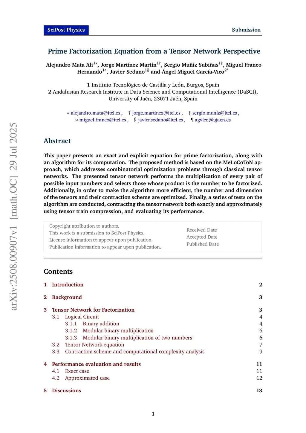This paper presents an exact and explicit equation for prime factorization, along with an algorithm for its computation. The proposed method is based on the MeLoCoToN approach, which addresses combinatorial optimization problems through classical tensor networks. The presented tensor network performs the multiplication of every pair of possible input numbers and selects those whose product is the number to be factorized. Additionally, in order to make the algorithm more efficient, the number and dimension of the tensors and their contraction scheme are optimized. Finally, a series of tests on the algorithm are conducted, contracting the tensor network both exactly and approximately using tensor train compression, and evaluating its performance.