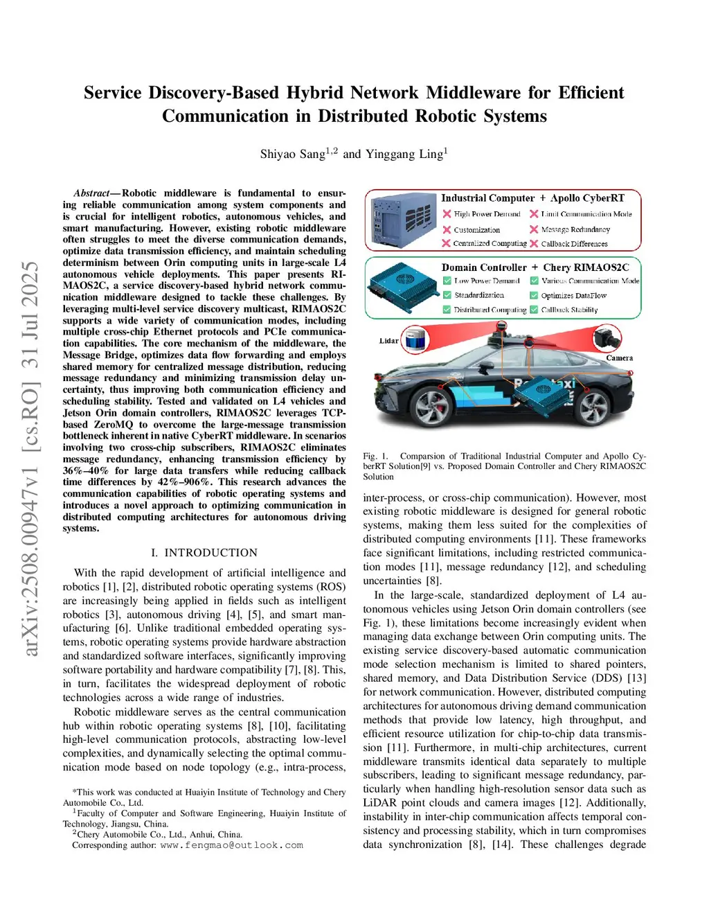 Robotic middleware is fundamental to ensuring reliable communication among system components and is crucial for intelligent robotics, autonomous vehicles, and smart manufacturing. However, existing robotic middleware often struggles to meet the diverse communication demands, optimize data transmission efficiency, and maintain scheduling determinism between Orin computing units in large-scale L4 autonomous vehicle deployments. This paper presents RIMAOS2C, a service discovery-based hybrid network communication middleware designed to tackle these challenges. By leveraging multi-level service discovery multicast, RIMAOS2C supports a wide variety of communication modes, including multiple cross-chip Ethernet protocols and PCIe communication capabilities. Its core mechanism, the Message Bridge, optimizes data flow forwarding and employs shared memory for centralized message distribution, reducing message redundancy and minimizing transmission delay uncertainty. Tested on L4 vehicles and Jetson Orin domain controllers, RIMAOS2C leverages TCP-based ZeroMQ to overcome the large-message transmission bottleneck in native CyberRT. In scenarios with two cross-chip subscribers, it eliminates message redundancy and improves large-data transmission efficiency by 36 to 40 percent while reducing callback latency variation by 42 to 906 percent. This research advances the communication capabilities of robotic operating systems and proposes a novel approach to optimizing communication in distributed computing architectures for autonomous driving.