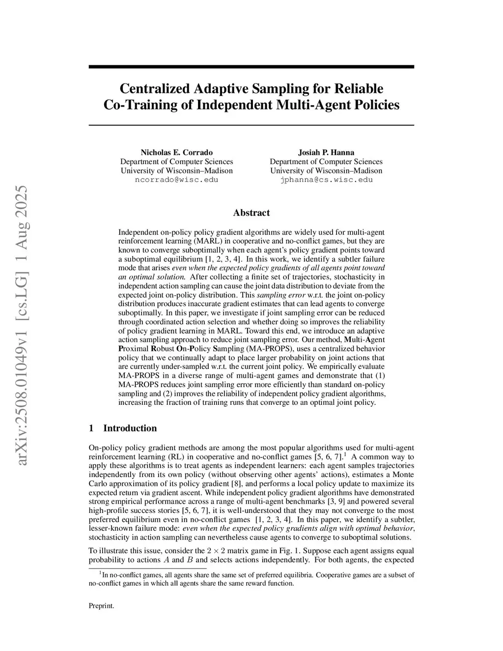 Independent on-policy policy gradient algorithms are widely used for multi-agent reinforcement learning (MARL) in cooperative and no-conflict games, but they are known to converge suboptimally when each agent's policy gradient points toward a suboptimal equilibrium. In this work, we identify a subtler failure mode that arises \textit{even when the expected policy gradients of all agents point toward an optimal solution.} After collecting a finite set of trajectories, stochasticity in independent action sampling can cause the joint data distribution to deviate from the expected joint on-policy distribution. This \textit{sampling error} w.r.t. the joint on-policy distribution produces inaccurate gradient estimates that can lead agents to converge suboptimally. In this paper, we investigate if joint sampling error can be reduced through coordinated action selection and whether doing so improves the reliability of policy gradient learning in MARL. Toward this end, we introduce an adaptive action sampling approach to reduce joint sampling error. Our method, Multi-Agent Proximal Robust On-Policy Sampling (MA-PROPS), uses a centralized behavior policy that we continually adapt to place larger probability on joint actions that are currently under-sampled w.r.t. the current joint policy. We empirically evaluate MA-PROPS in a diverse range of multi-agent games and demonstrate that (1) MA-PROPS reduces joint sampling error more efficiently than standard on-policy sampling and (2) improves the reliability of independent policy gradient algorithms, increasing the fraction of training runs that converge to an optimal joint policy.