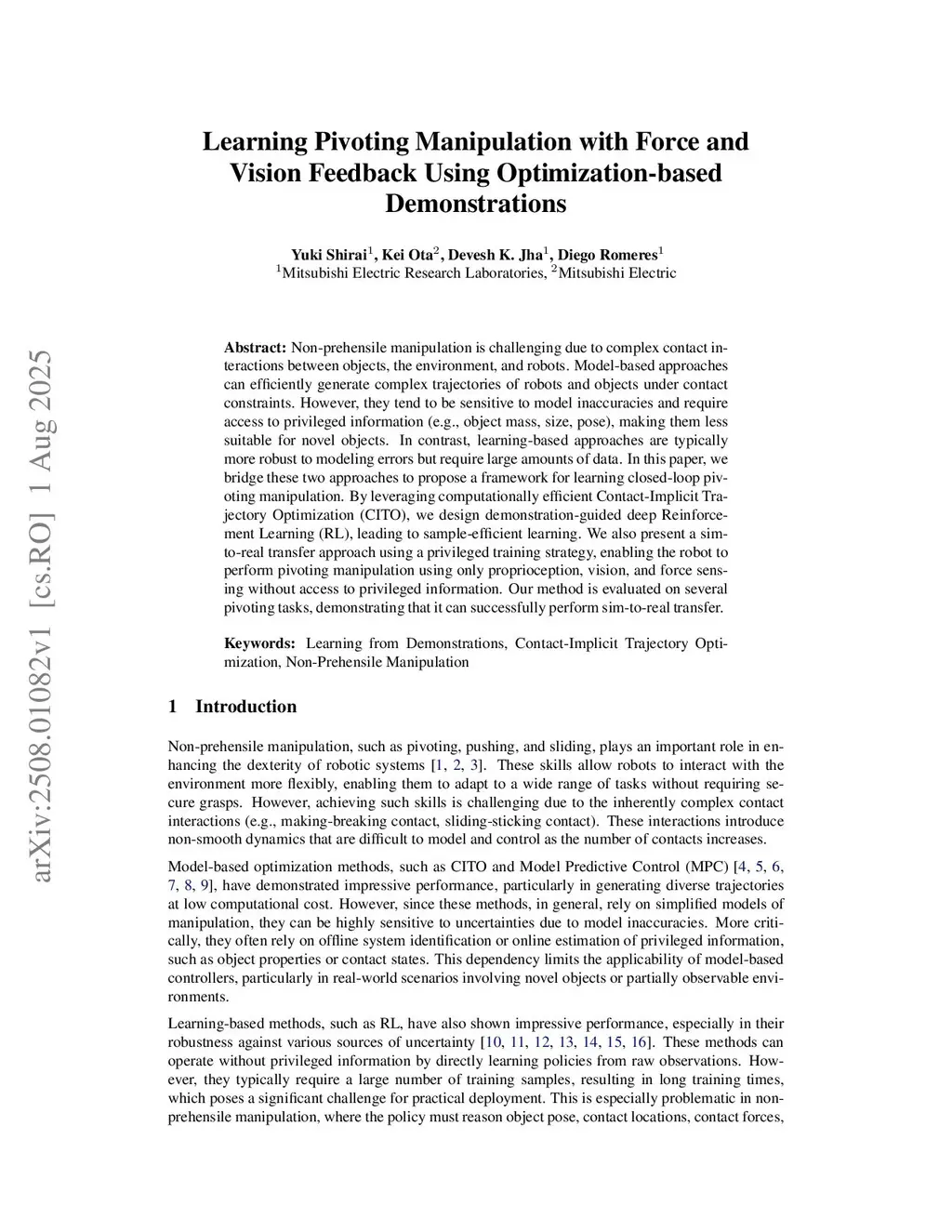 Learning Pivoting Manipulation with Force and Vision Feedback Using Optimization-based Demonstrations