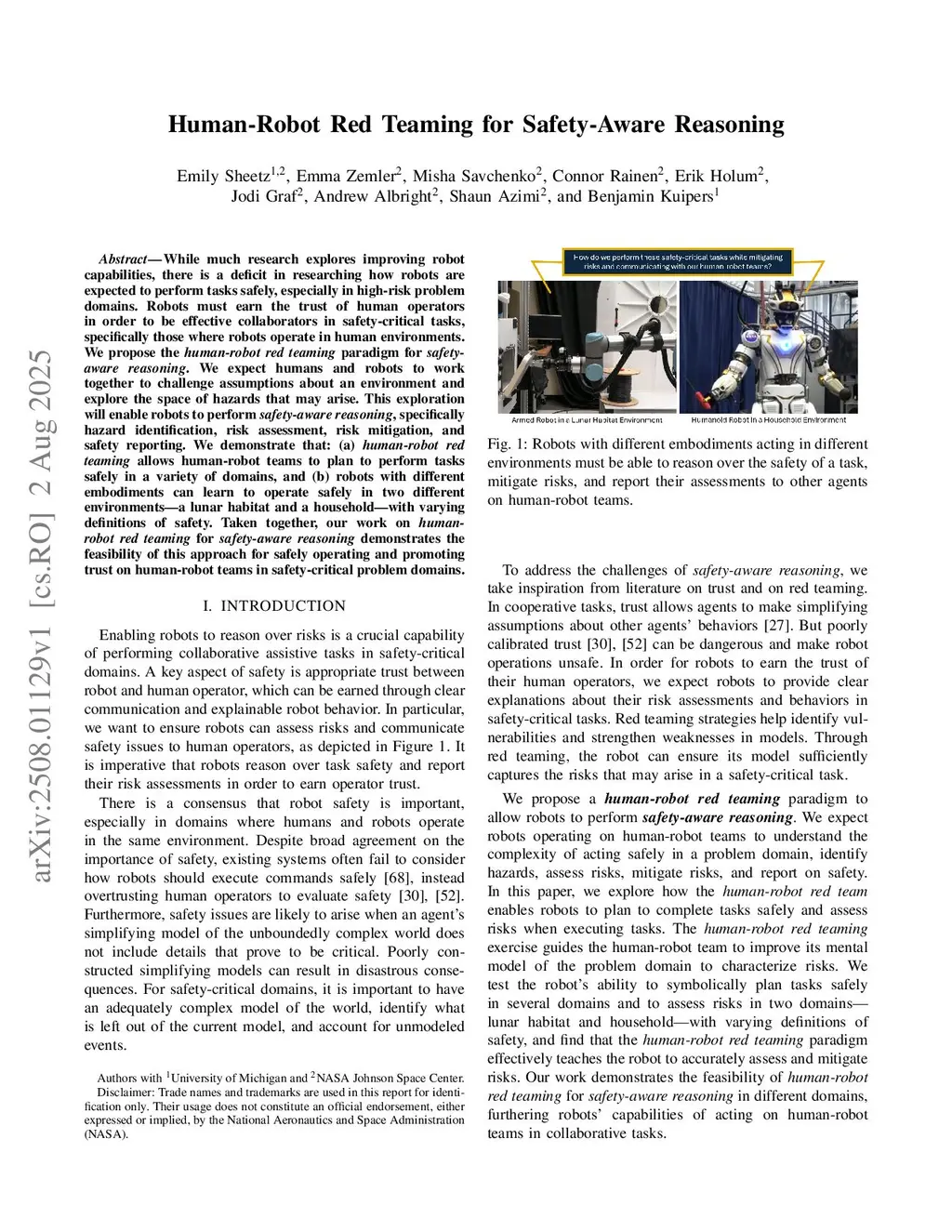 While much research explores improving robot capabilities, there is a deficit in researching how robots are expected to perform tasks safely, especially in high-risk problem domains. Robots must earn the trust of human operators in order to be effective collaborators in safety-critical tasks, specifically those where robots operate in human environments. We propose the human-robot red teaming paradigm for safety-aware reasoning. We expect humans and robots to work together to challenge assumptions about an environment and explore the space of hazards that may arise. This exploration will enable robots to perform safety-aware reasoning, specifically hazard identification, risk assessment, risk mitigation, and safety reporting. We demonstrate that: (a) human-robot red teaming allows human-robot teams to plan to perform tasks safely in a variety of domains, and (b) robots with different embodiments can learn to operate safely in two different environments -- a lunar habitat and a household -- with varying definitions of safety. Taken together, our work on human-robot red teaming for safety-aware reasoning demonstrates the feasibility of this approach for safely operating and promoting trust on human-robot teams in safety-critical problem domains.